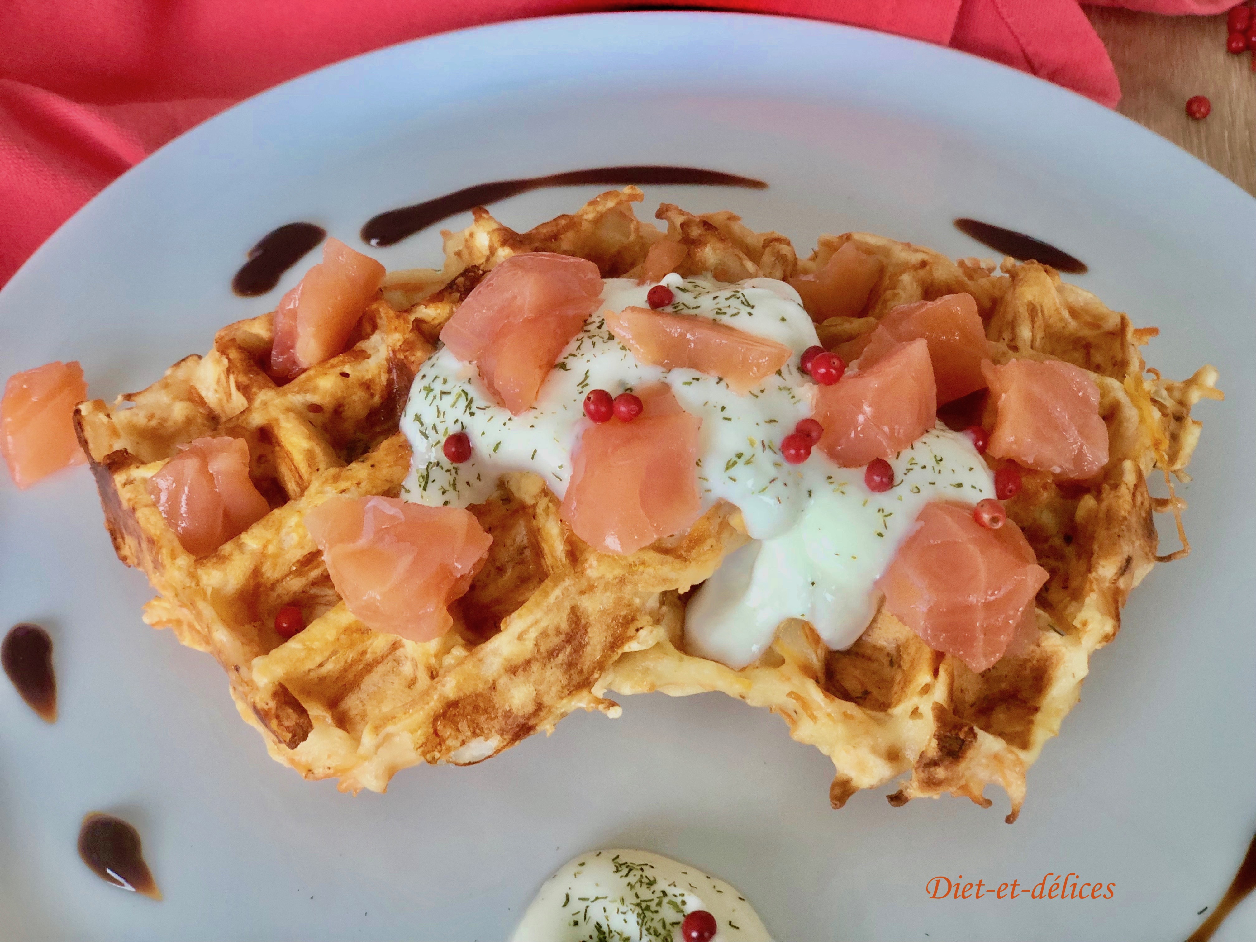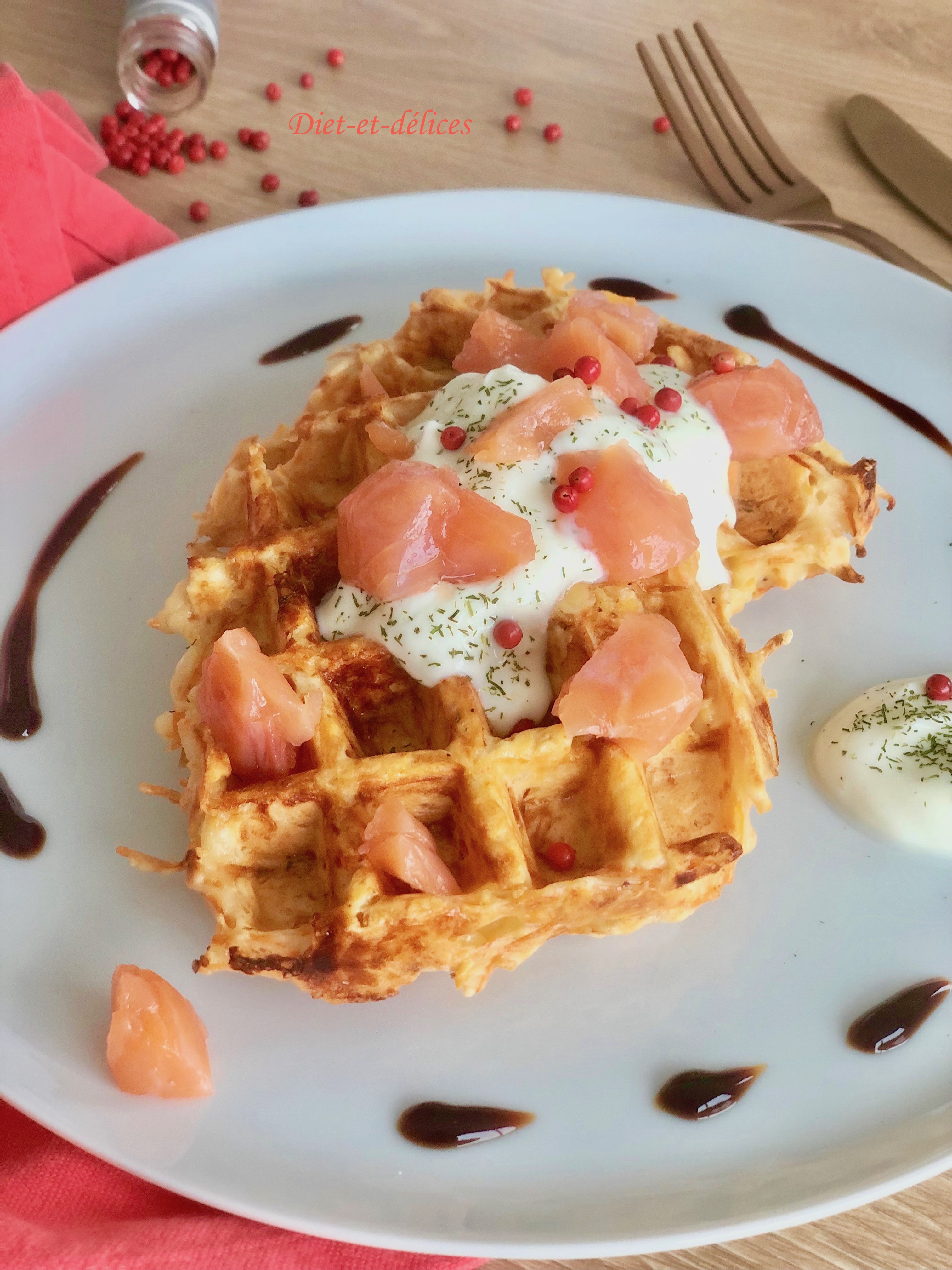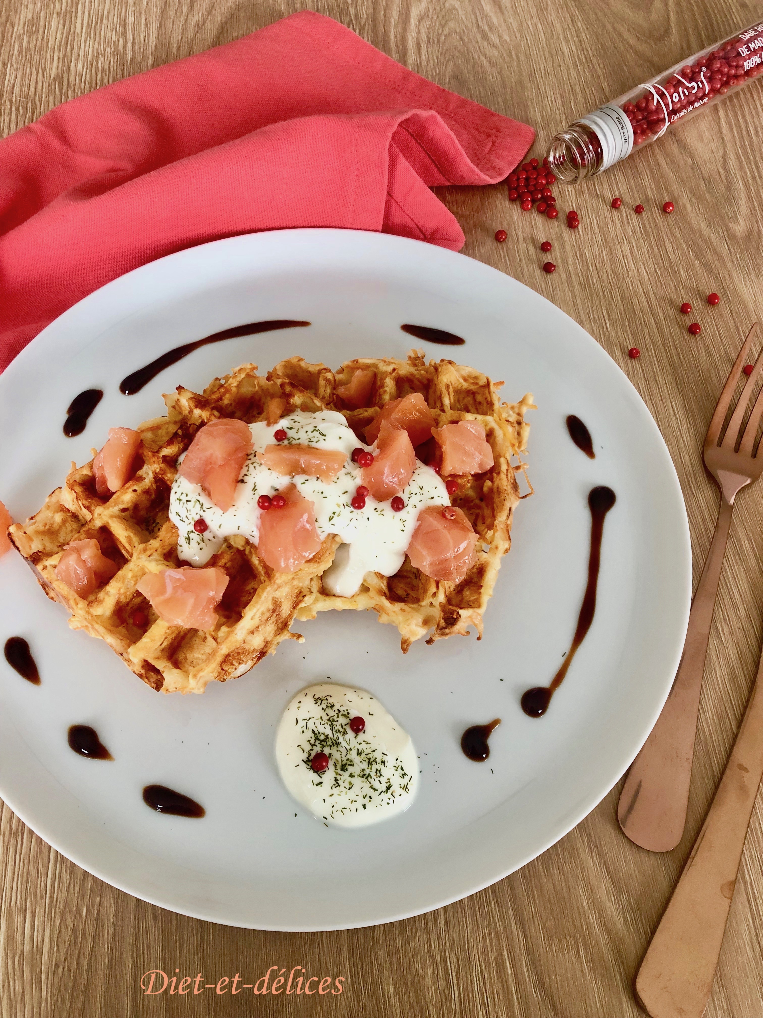 gaufres, gaufres salée, gaufres de carottes, carottes, saumon, saumon fumé, fromage blanc, aneth, plat complet, baies roses
