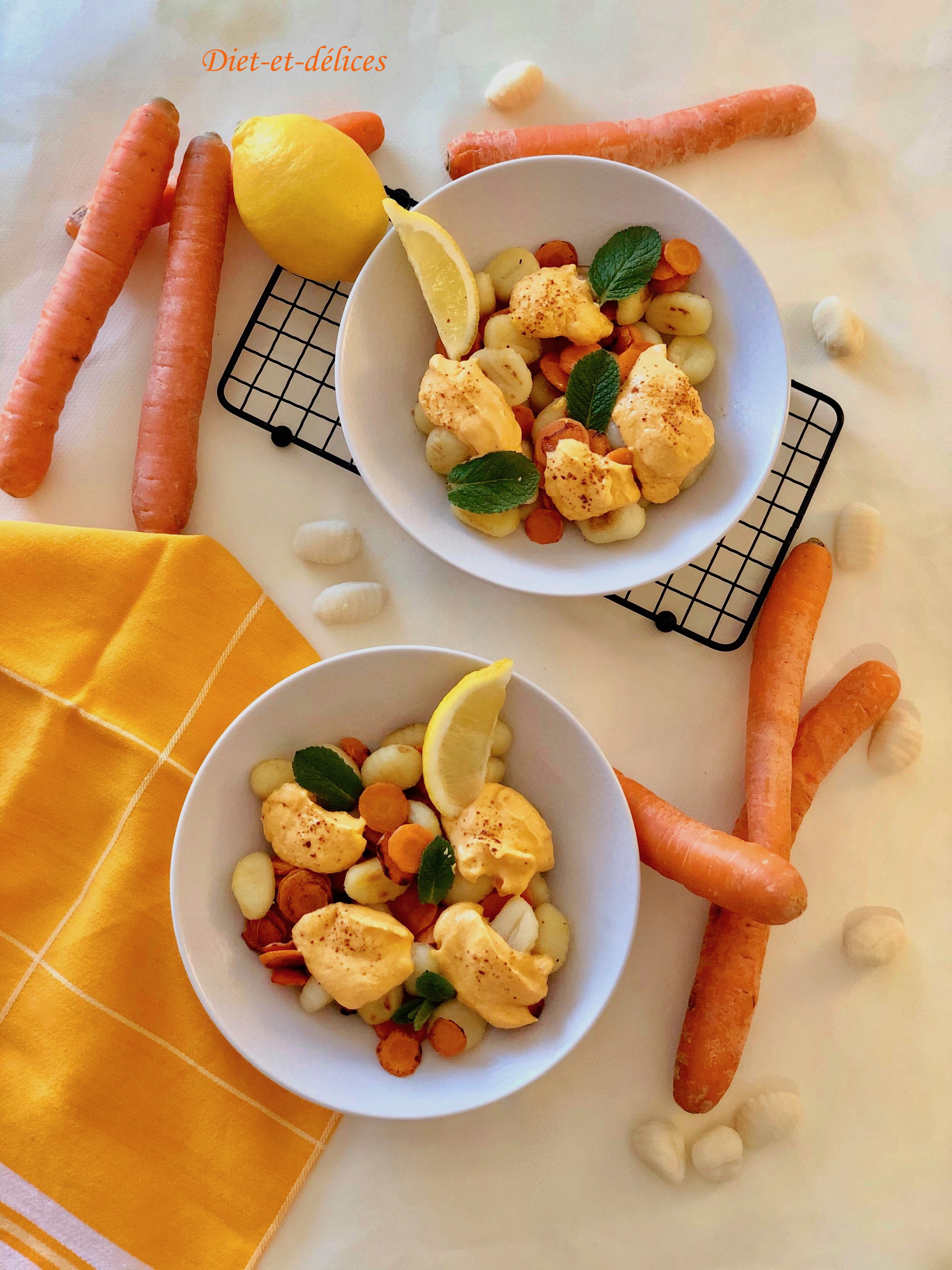 carottes, gnocchi, sauce à la carottementhe, gnocchi aux carottes, citron