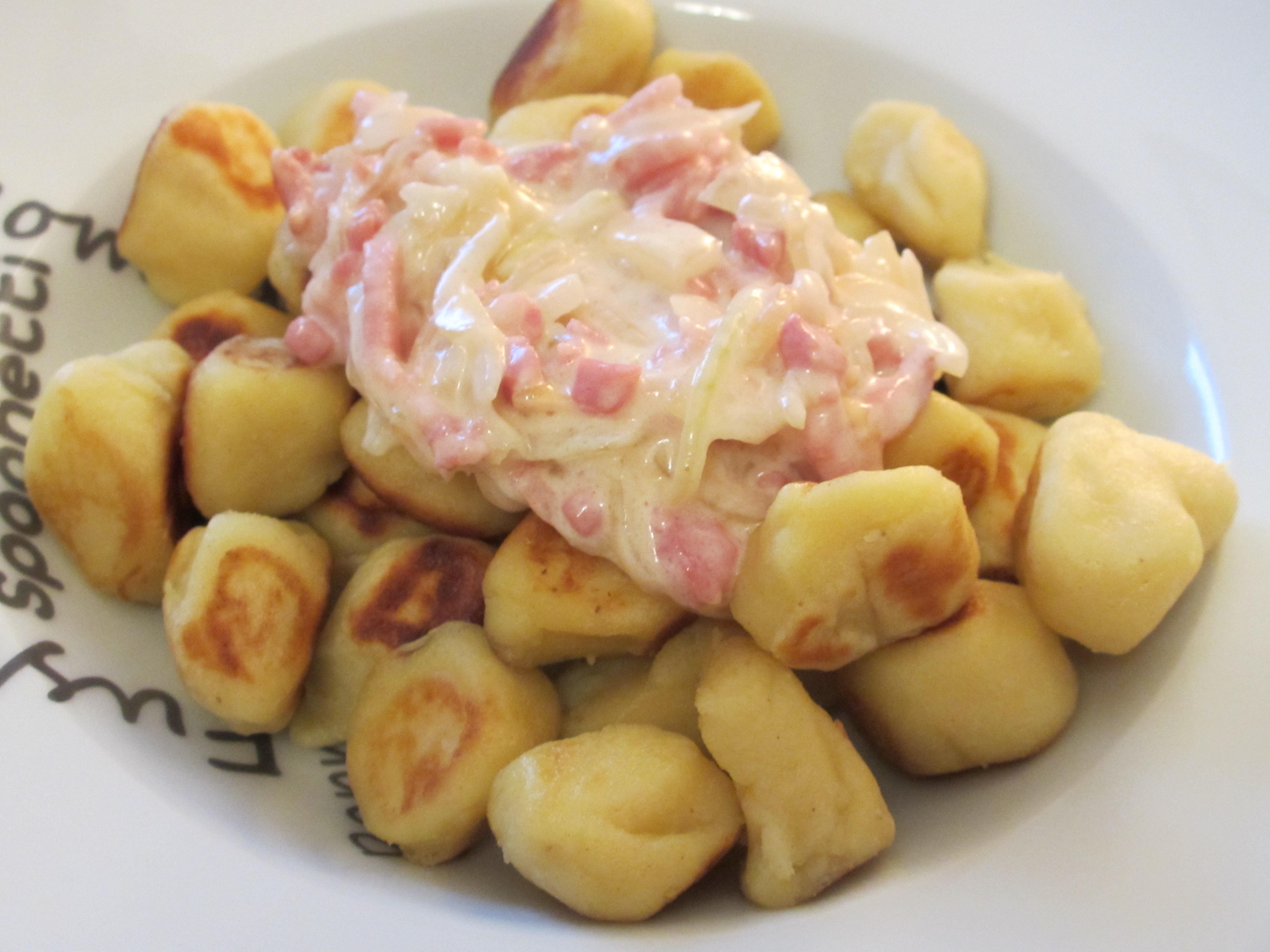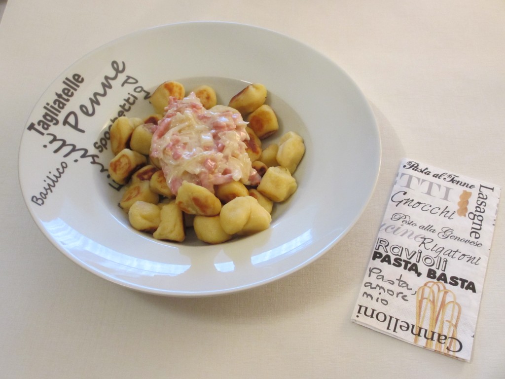 gnocchis, gnocchis rôtis, pâtes, purée, carbonara, pâtes à la carbonara oignon, crème,lardons, sauce, recette italienne