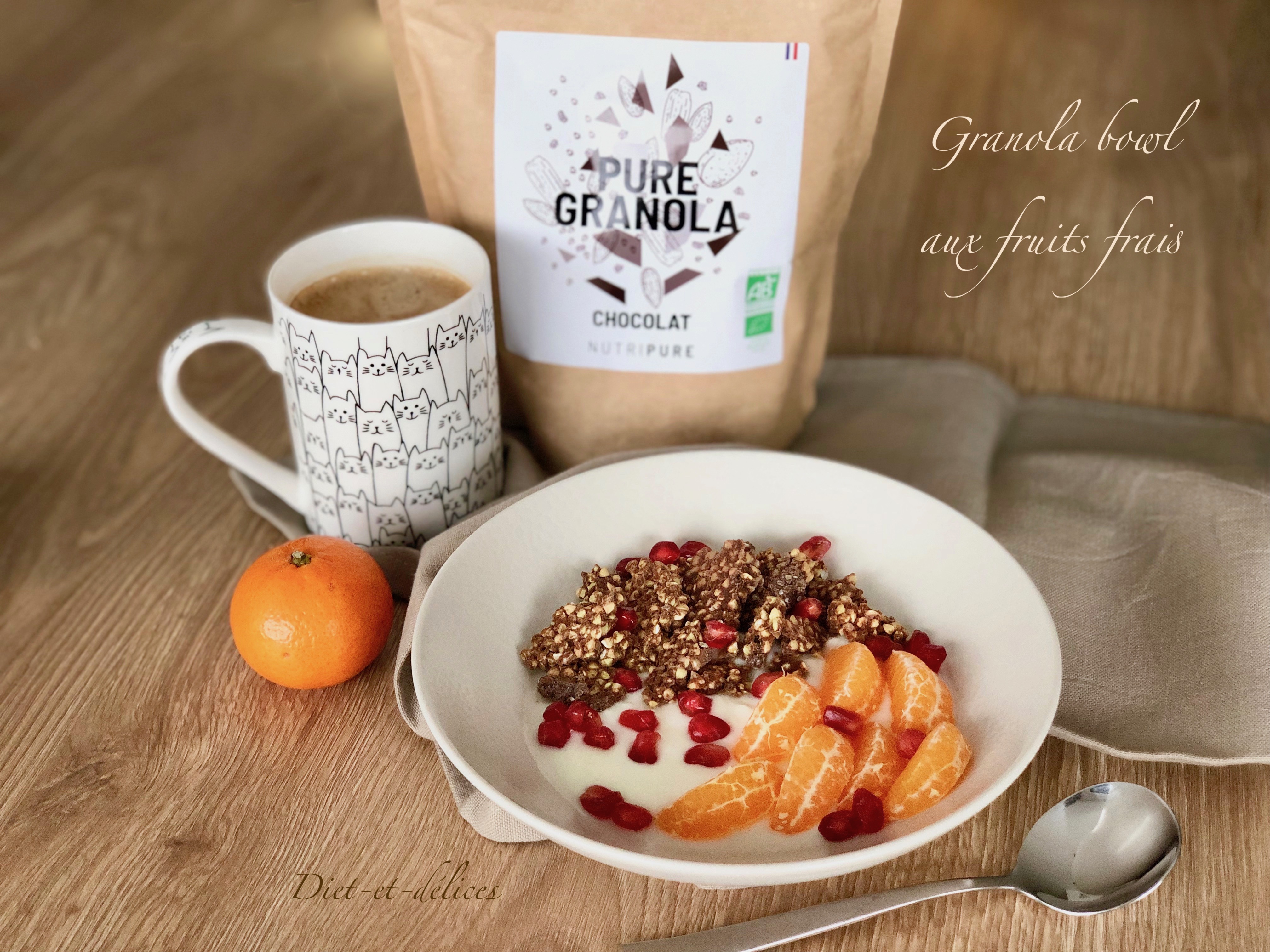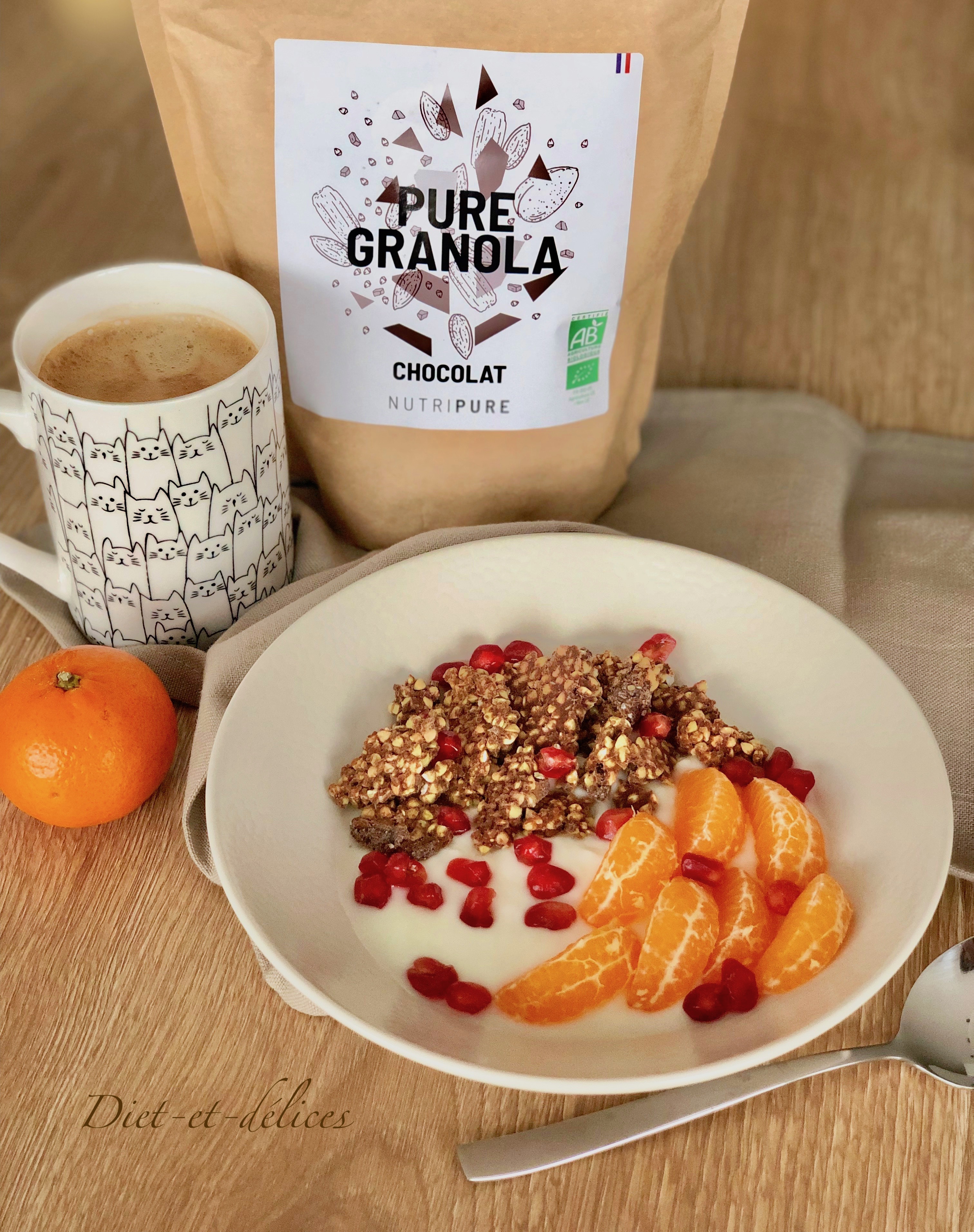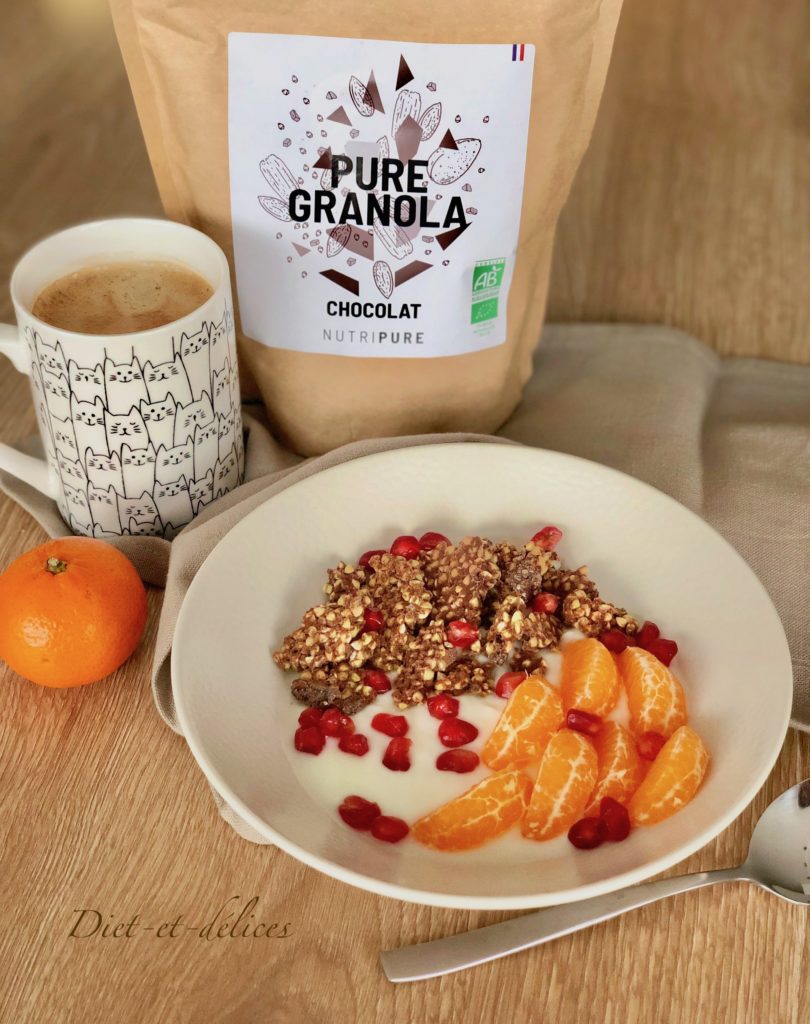 – Le pure granola chocolat Nutripure se compose de pépites de chocolat noir, d’amandes, de protéine de riz, de sarrasin et de datte. Il est disponible en sachet de 350 g ou de 2 kg. A base d’ingrédients bruts, il est incomparable aux granulas ou muesli sucrés et ultra transformés que l’on trouve habituellement dans le commerce. Il est vegan, sans gluten, sans conservateur ni sucre ajouté et est riche en fibres.