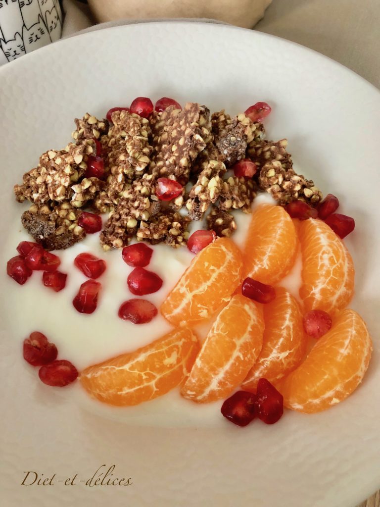 granola, petit-déjeuner, yaourt, clémentine, grenade, breakfast