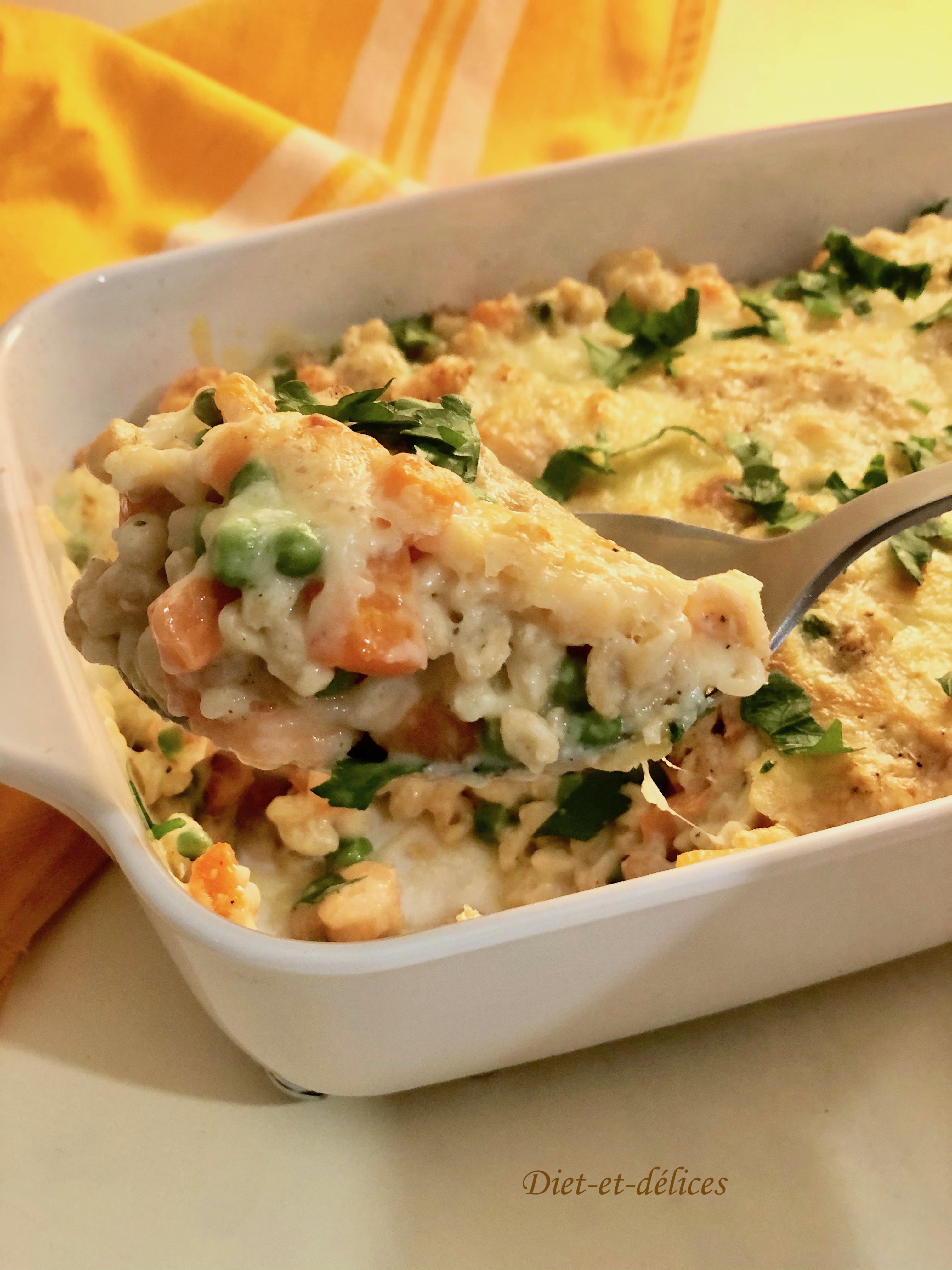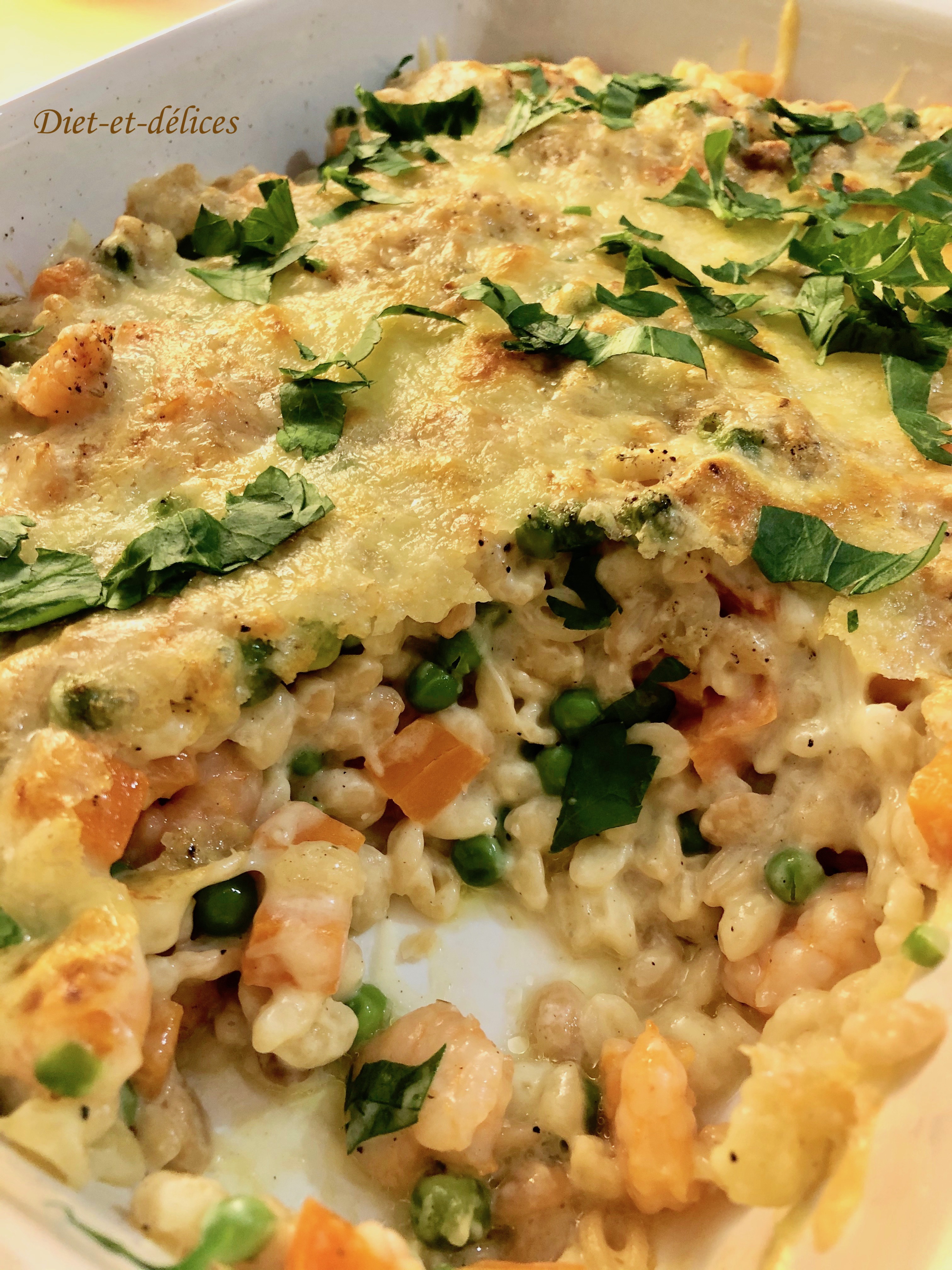 gratin, gratin de pâtes, pâtes, crevettes, petits pois, carottes, béchamel, plat complet