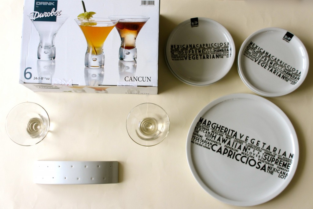 - – pour l’apéro, tout ce qu’il vous faut pour boire un coup ou pour grignoter : verres, présentoir à apéritif, piques apéritives, des couverts à cocktail…