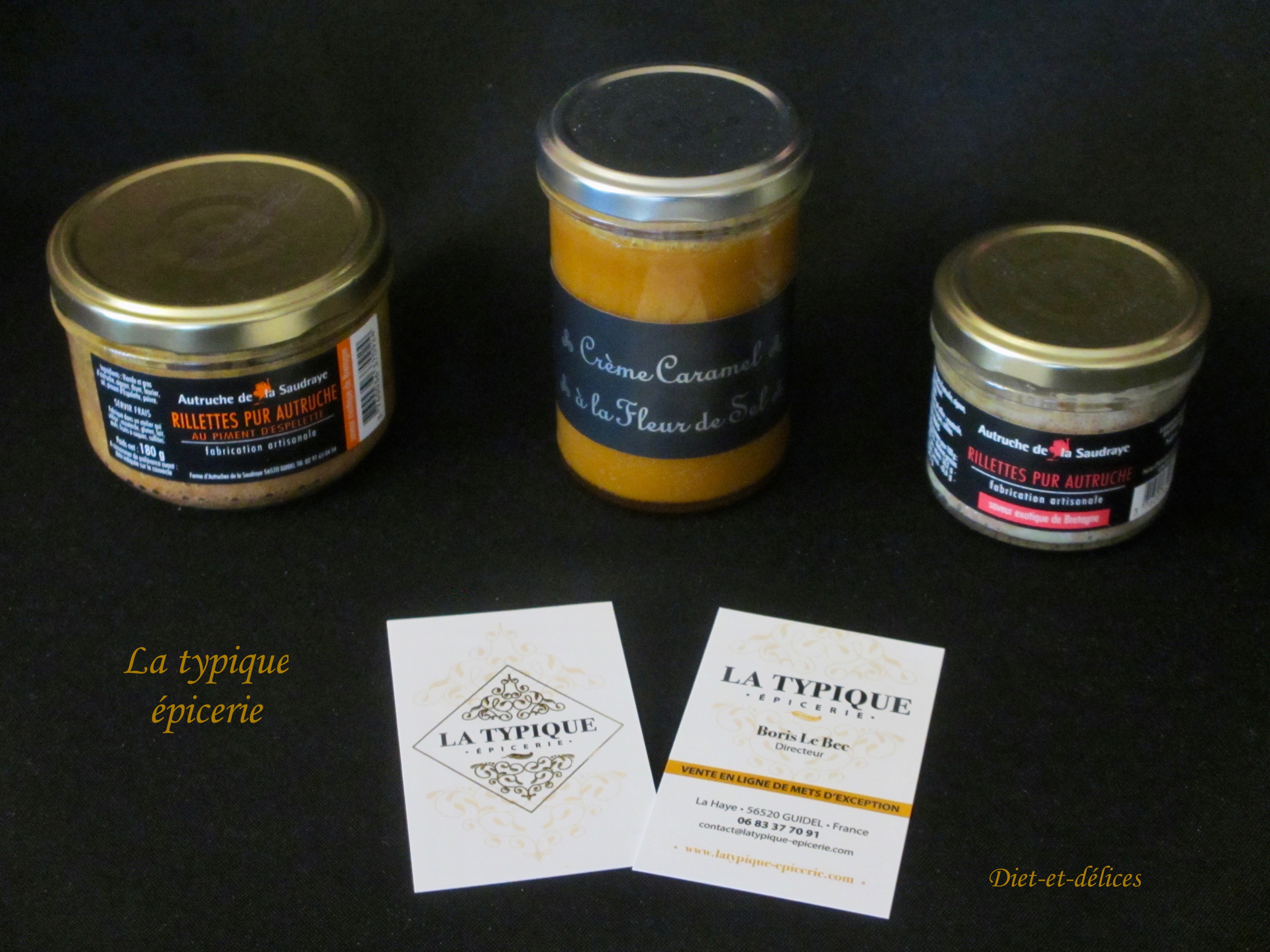 Je remercie grandement mon partenaire La typique épicerie. J’ai eu le plaisir de recevoir des rillettes pur autruche au piment d’Espelette, des rillettes pur autruche à la saveur exotique de Bretagne, de la crème caramel à la fleur de sel.