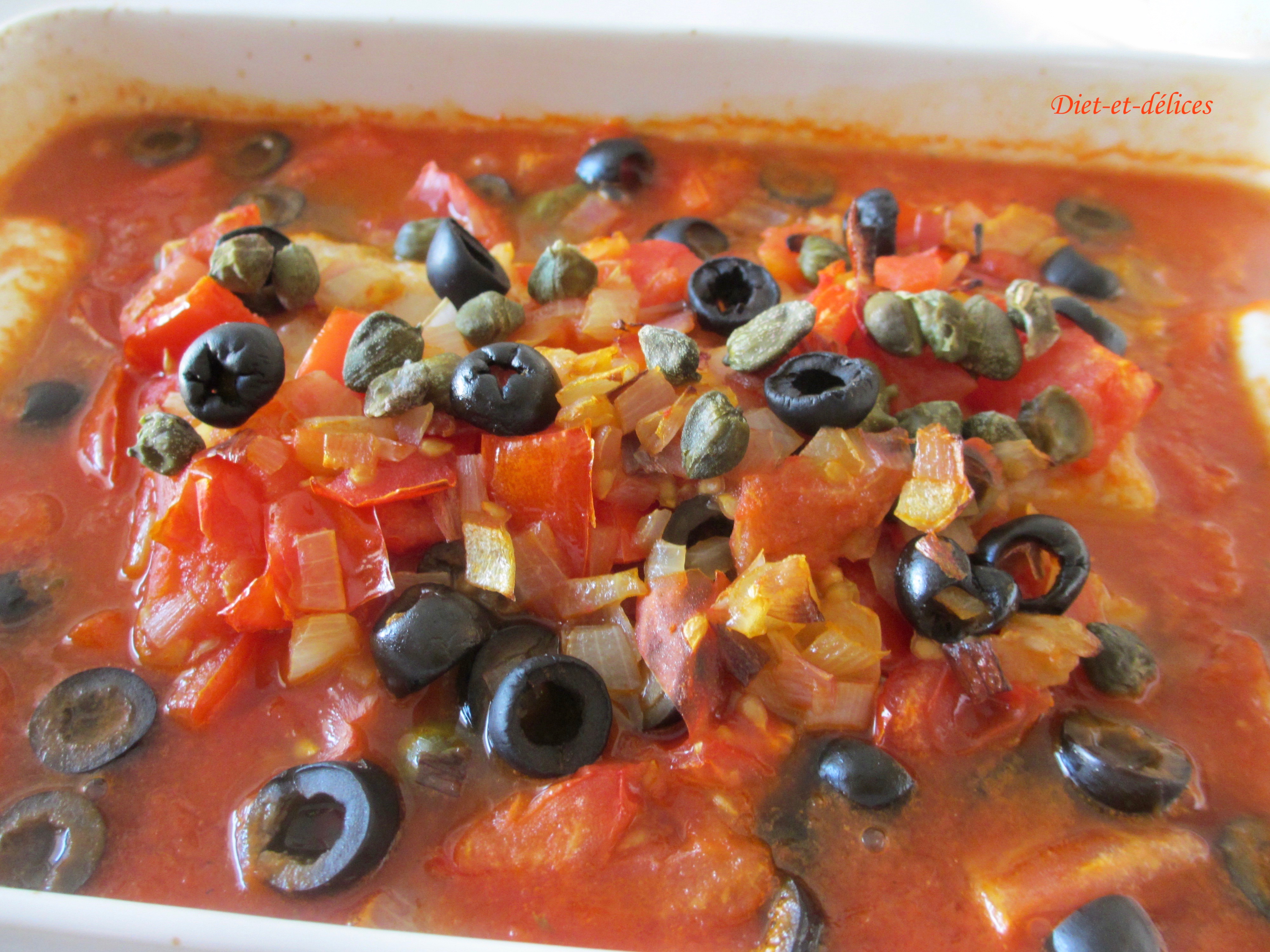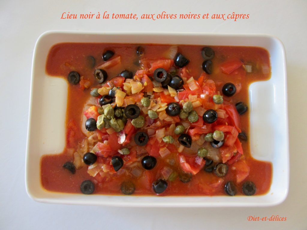 lieu noir, tomate, sauce tomate, poisson blanc, câpres, olives noires