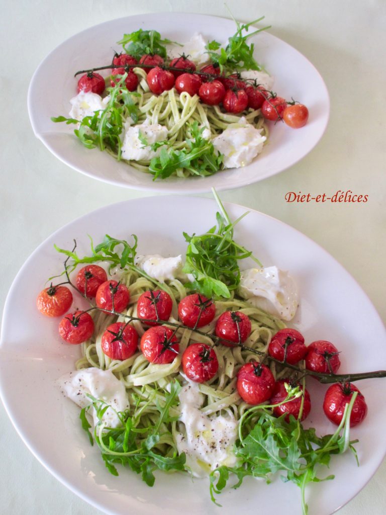 végétarien, pâtes, linguine, burrata, tomates cerises, roquette