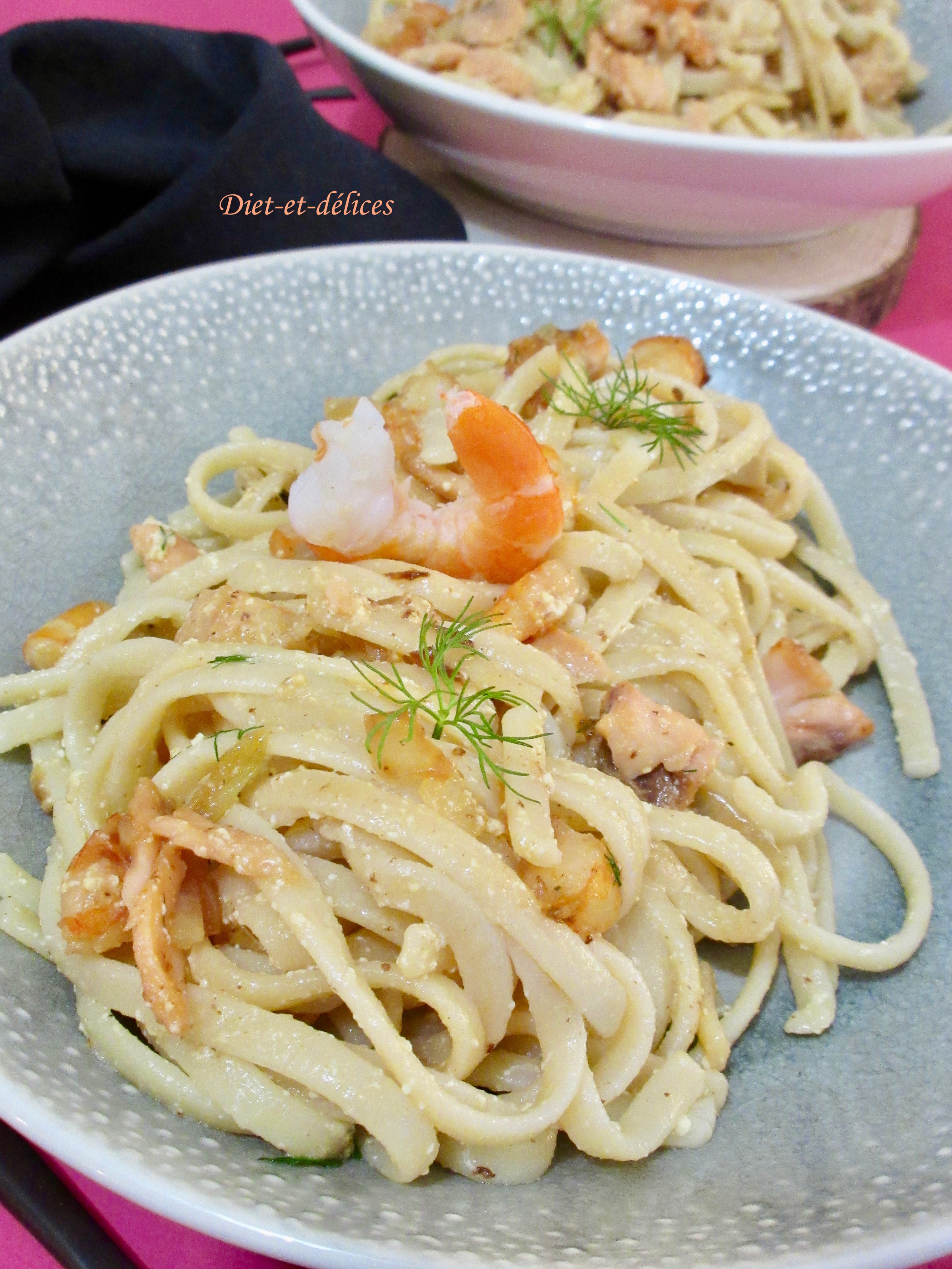 linguine, saumon, crevettes, linguine au poisson, saumon fumé, jaune d’oeuf, plat complet, aneth, pecorino