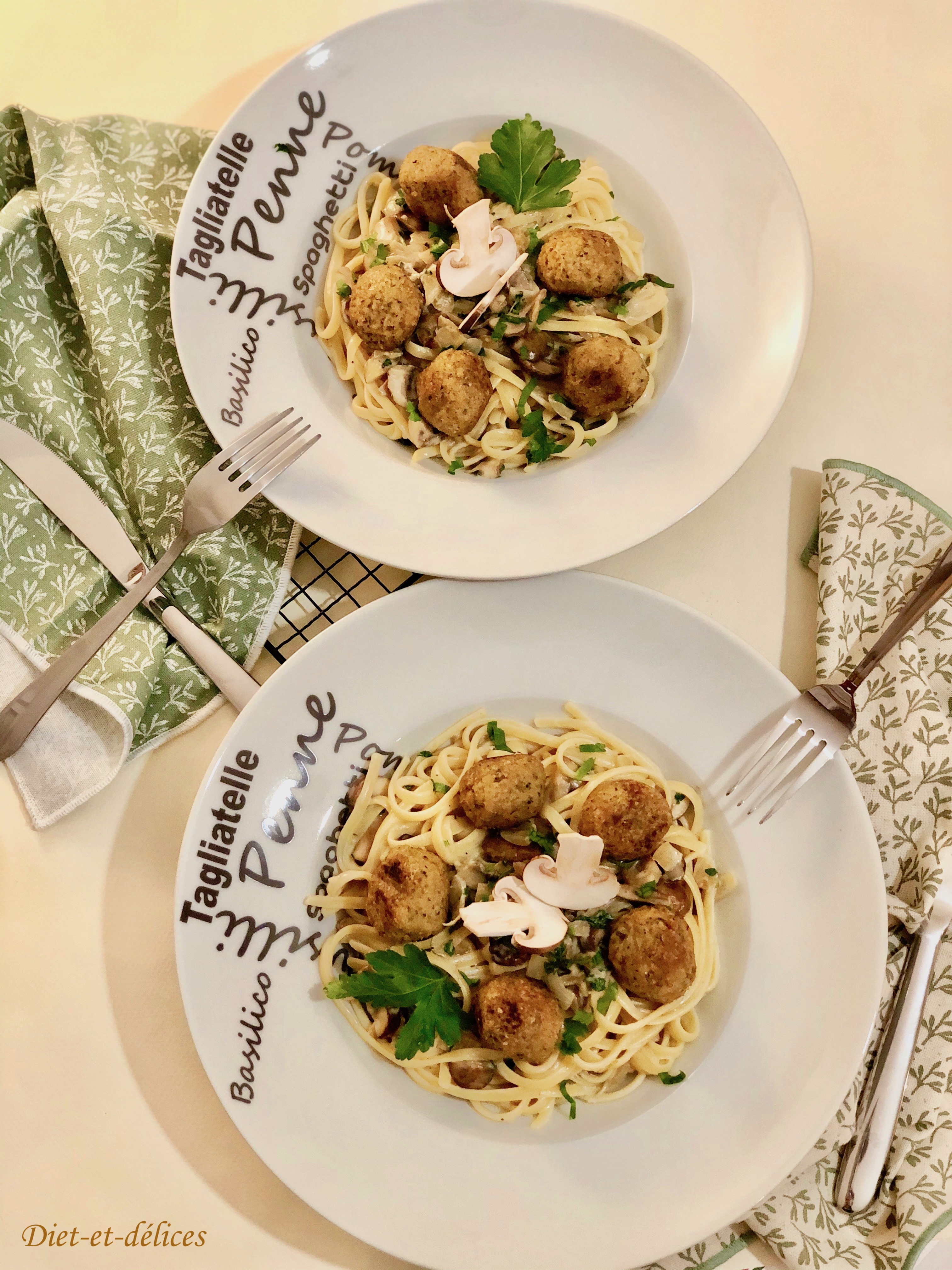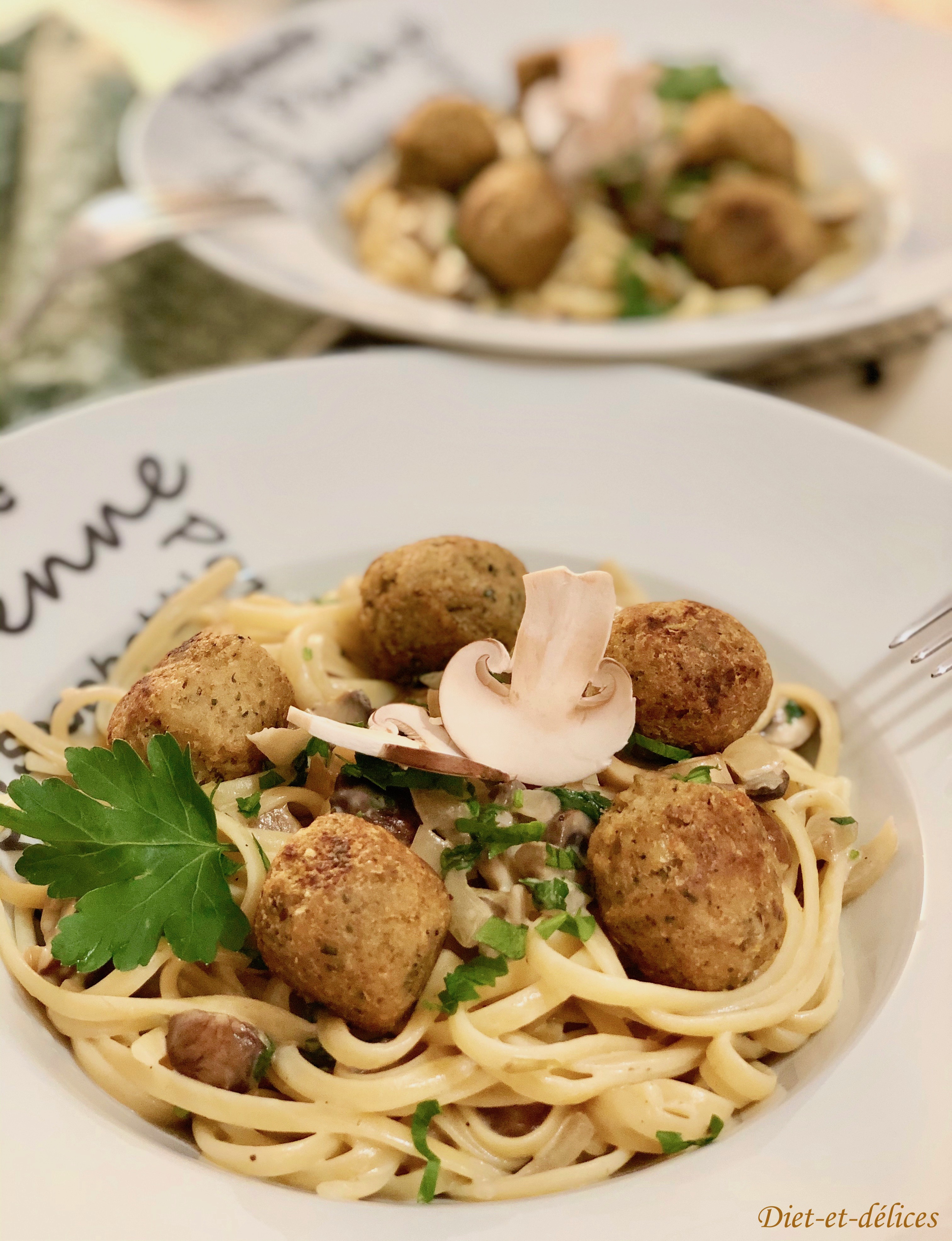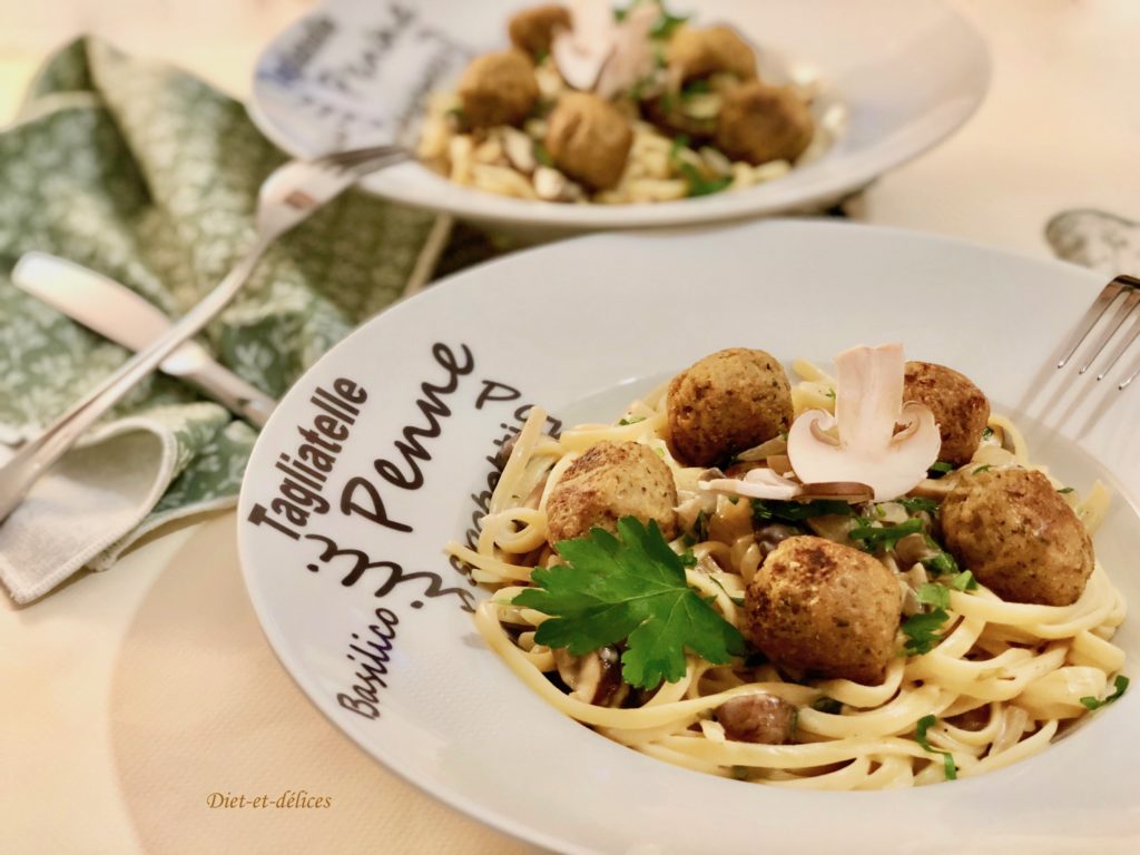boulettes, boulettes végétales, pâtes, linguine, sauce aux champignons, champignons