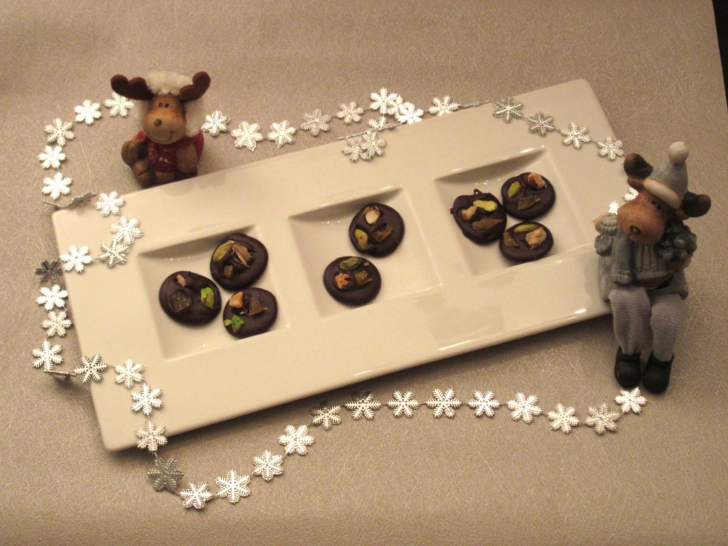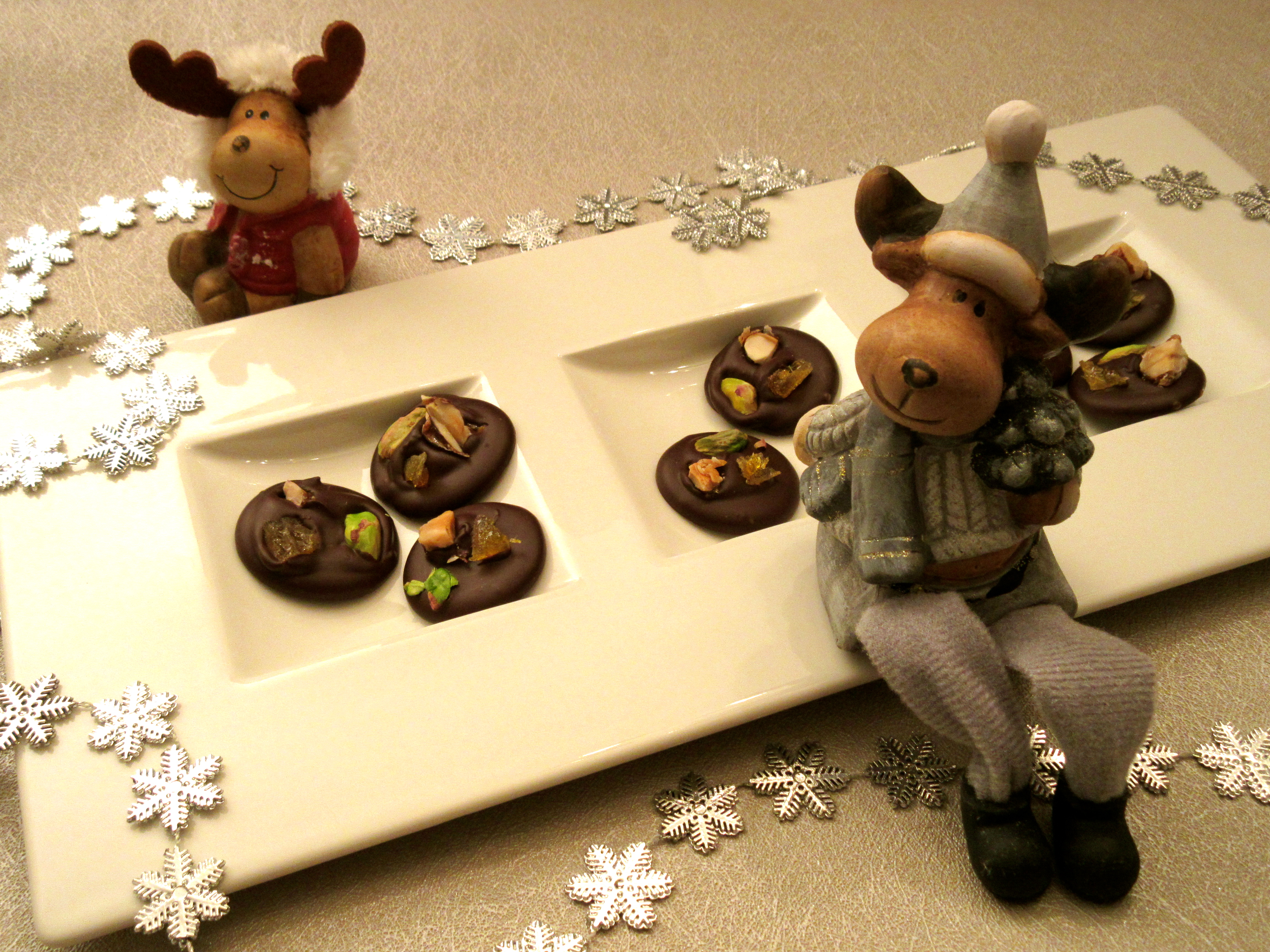 mendiant, mendiant au chocolat, chocolat noir, palets de chocolat,clémentines confites, nougat noir, pistache, dessert de fêtes, dessert