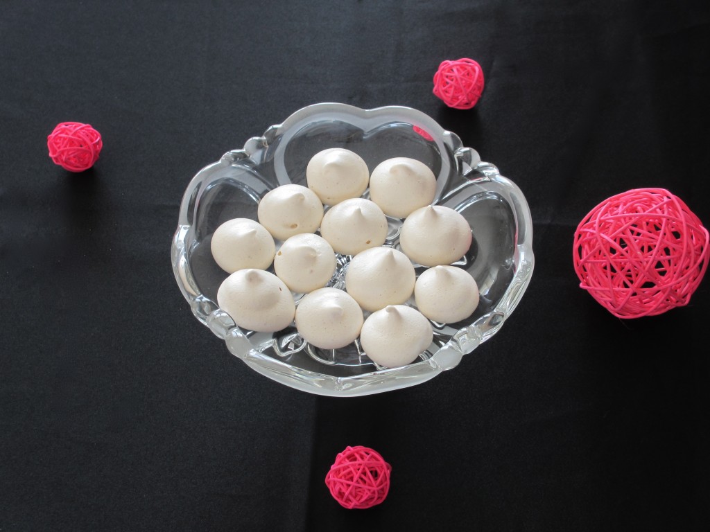 - Mettre la meringue dans une poche à douille. Dresser des petites meringues sur une plaque recouverte d’un papier cuisson.