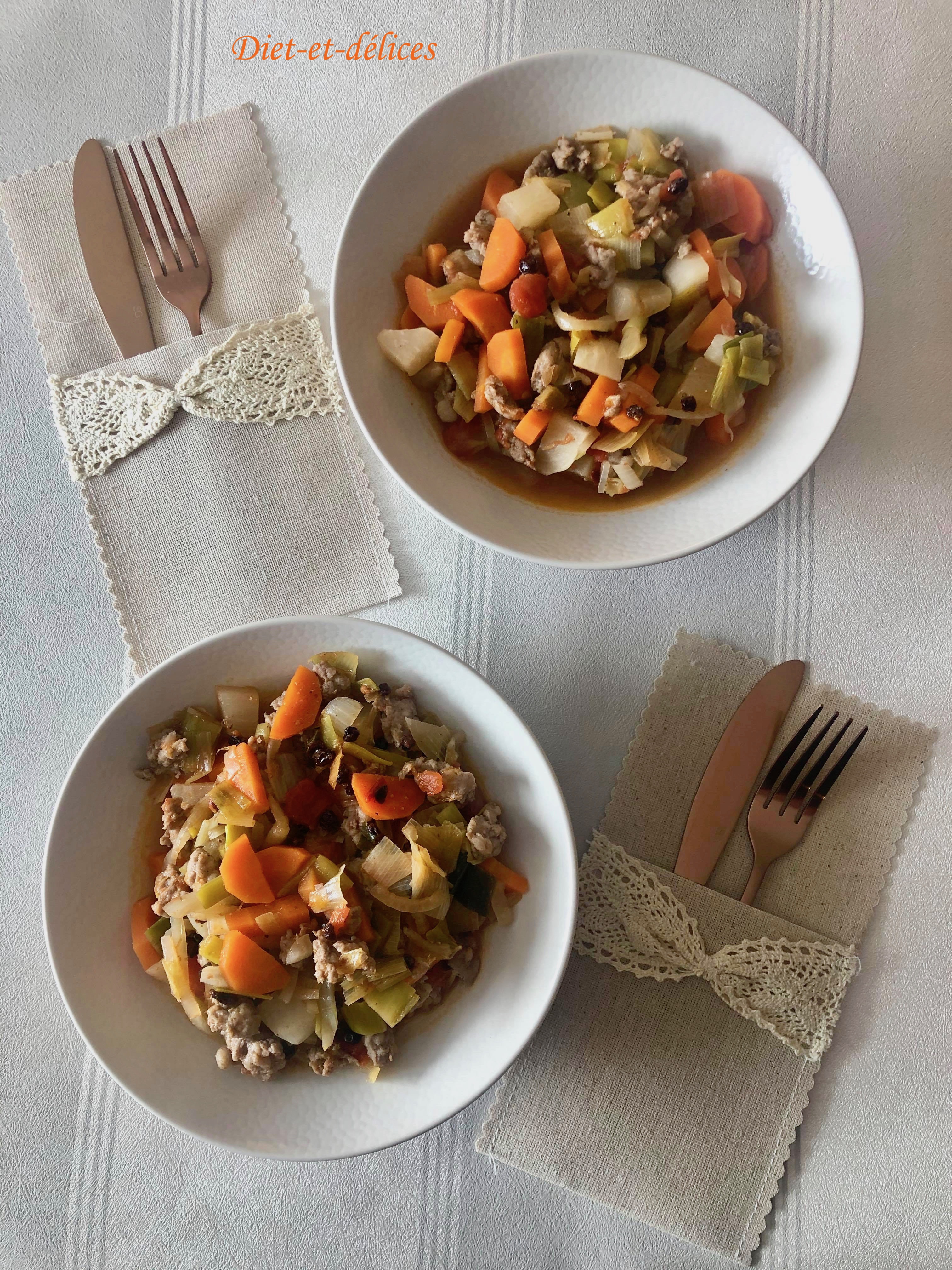 chair à saucisse, porc haché, navet, tomates concassées, poireau, raisins secs, carotte, viande hachée