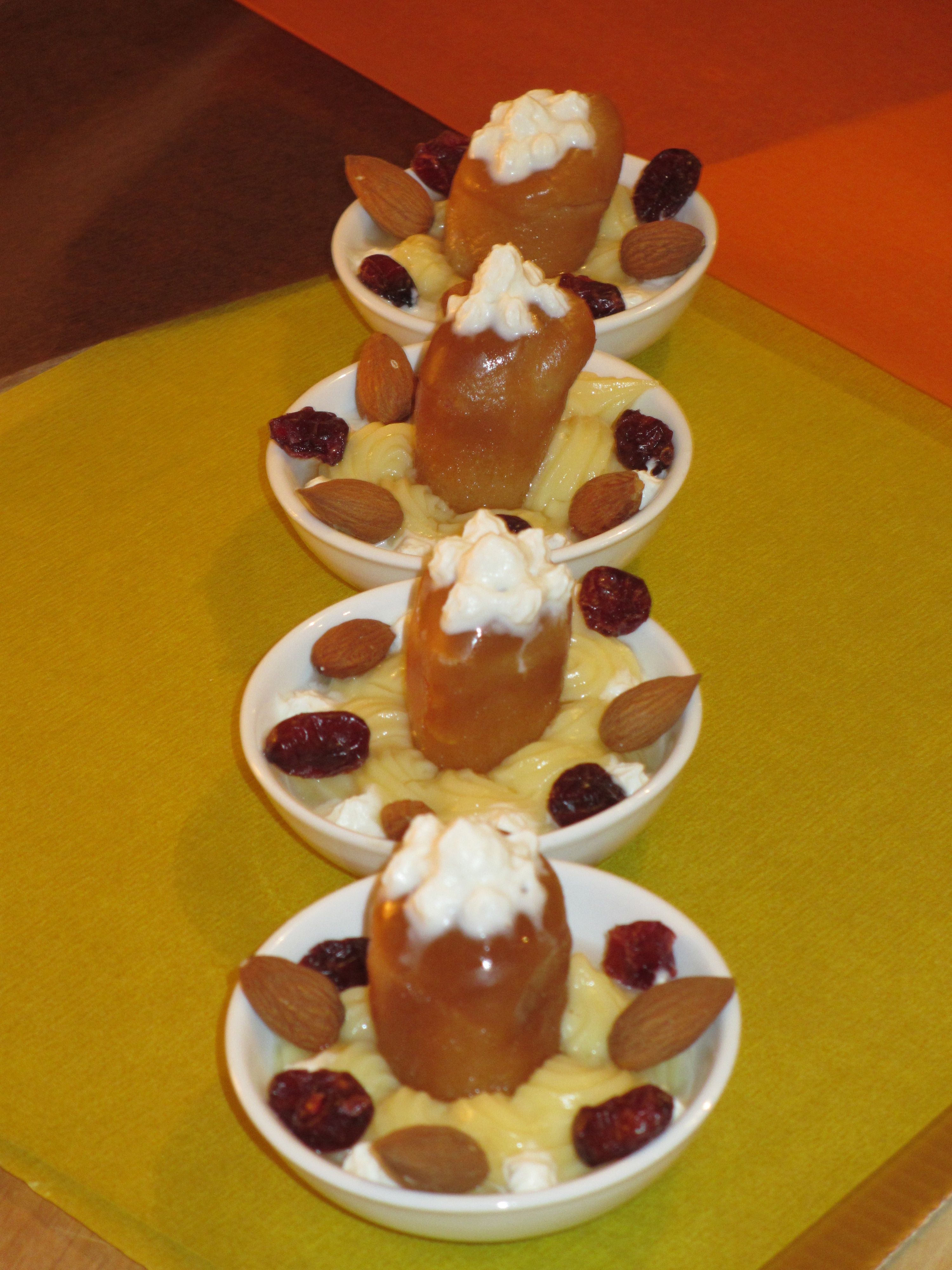 - Autour du baba, alterner les canneberges imbibées a rhum et les amandes entières.