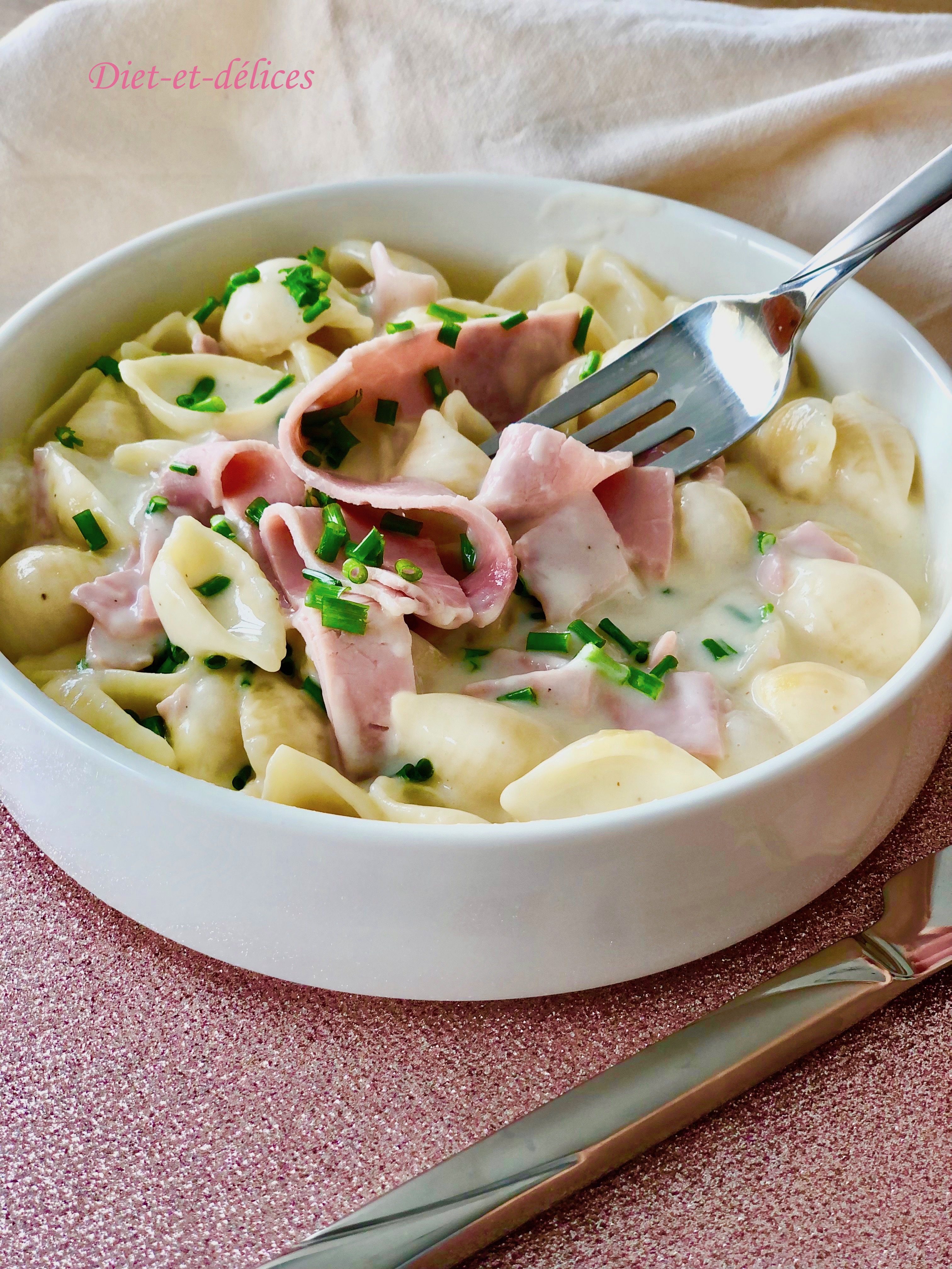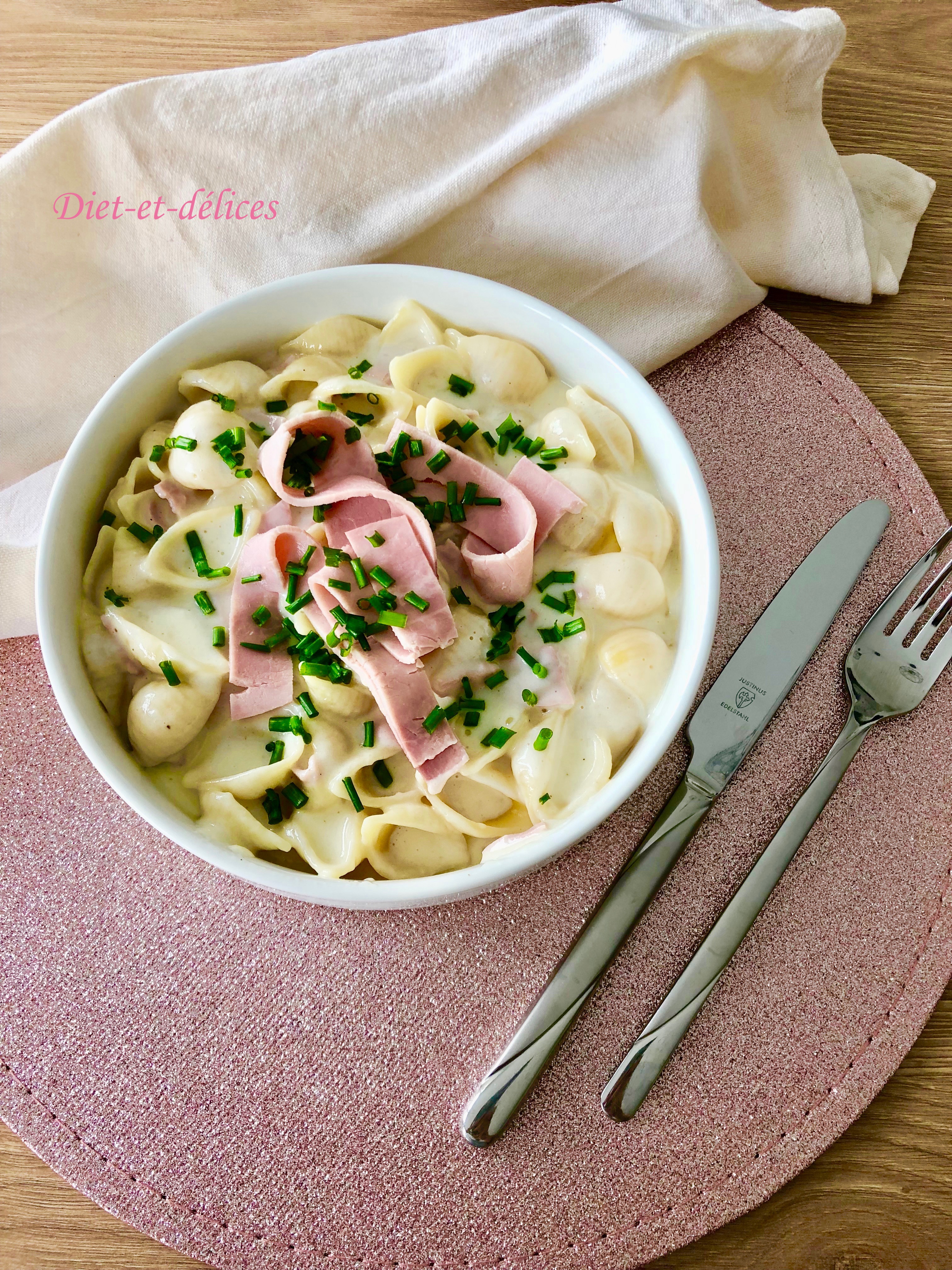conchiglioni, pâtes, jambon, mozzarella, sauce au fromage, jambon blanc, cheddar, plat complet