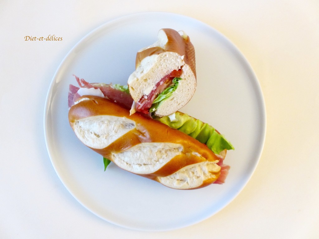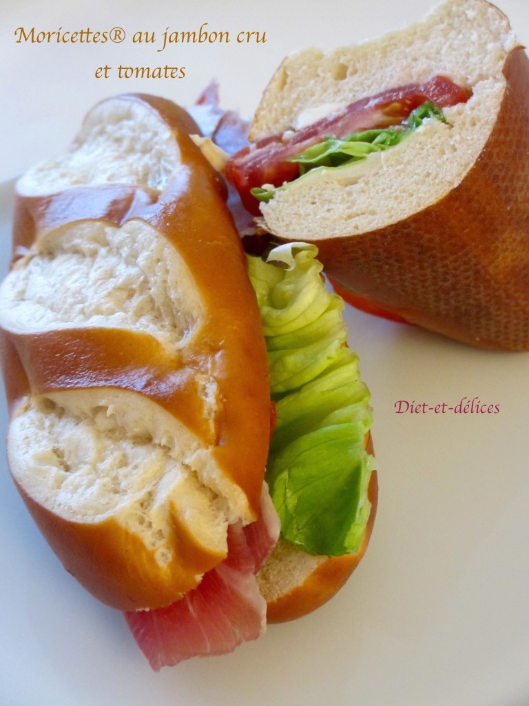 moricettes, bretzel, jambon, jambon fumé, jambon sec, tomates, sandwich