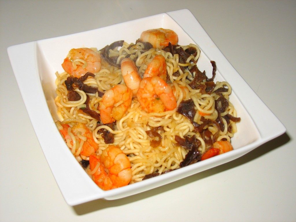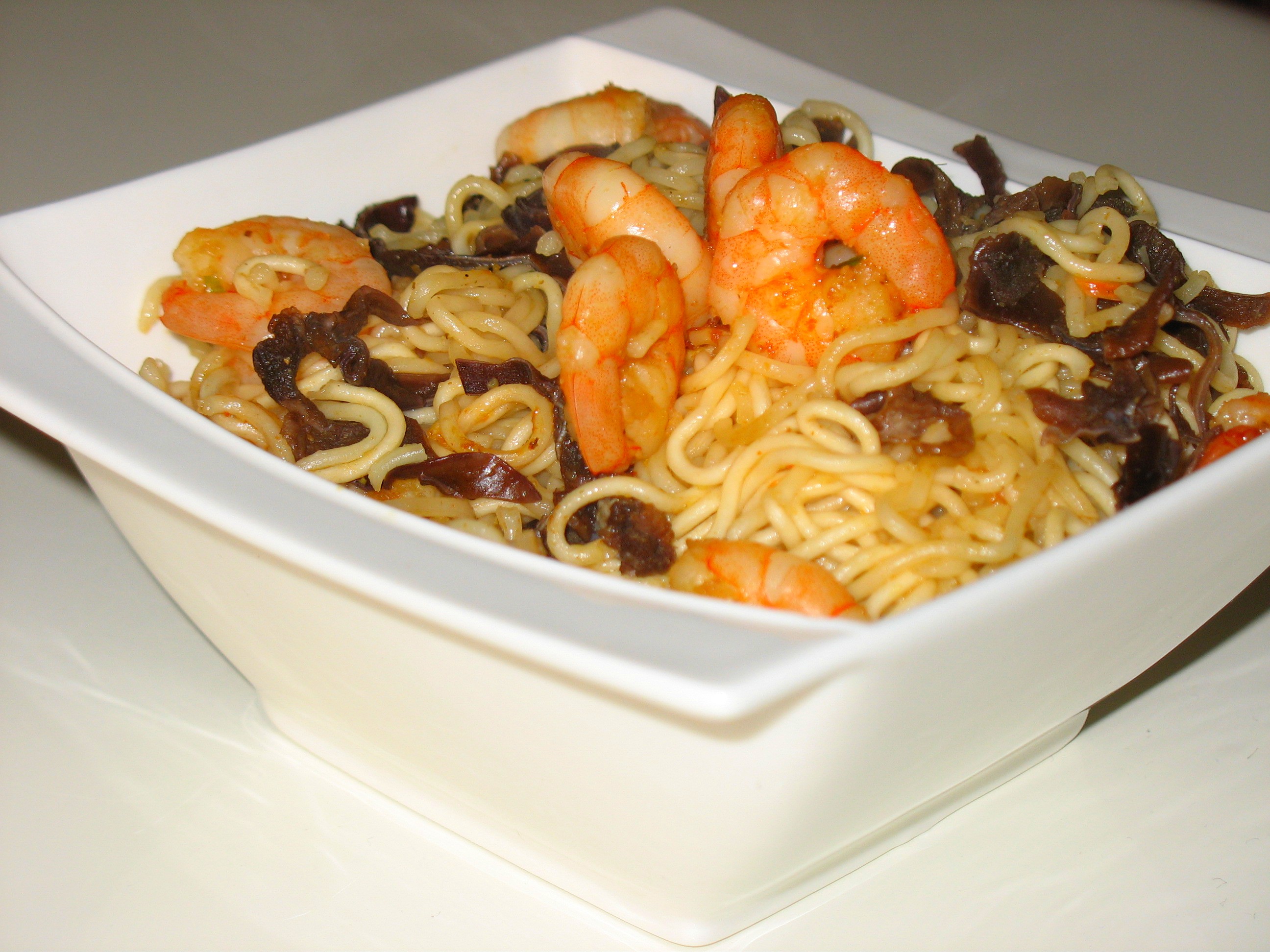 - Egoutter et incorporer aux crevettes les nouilles et les champignons.