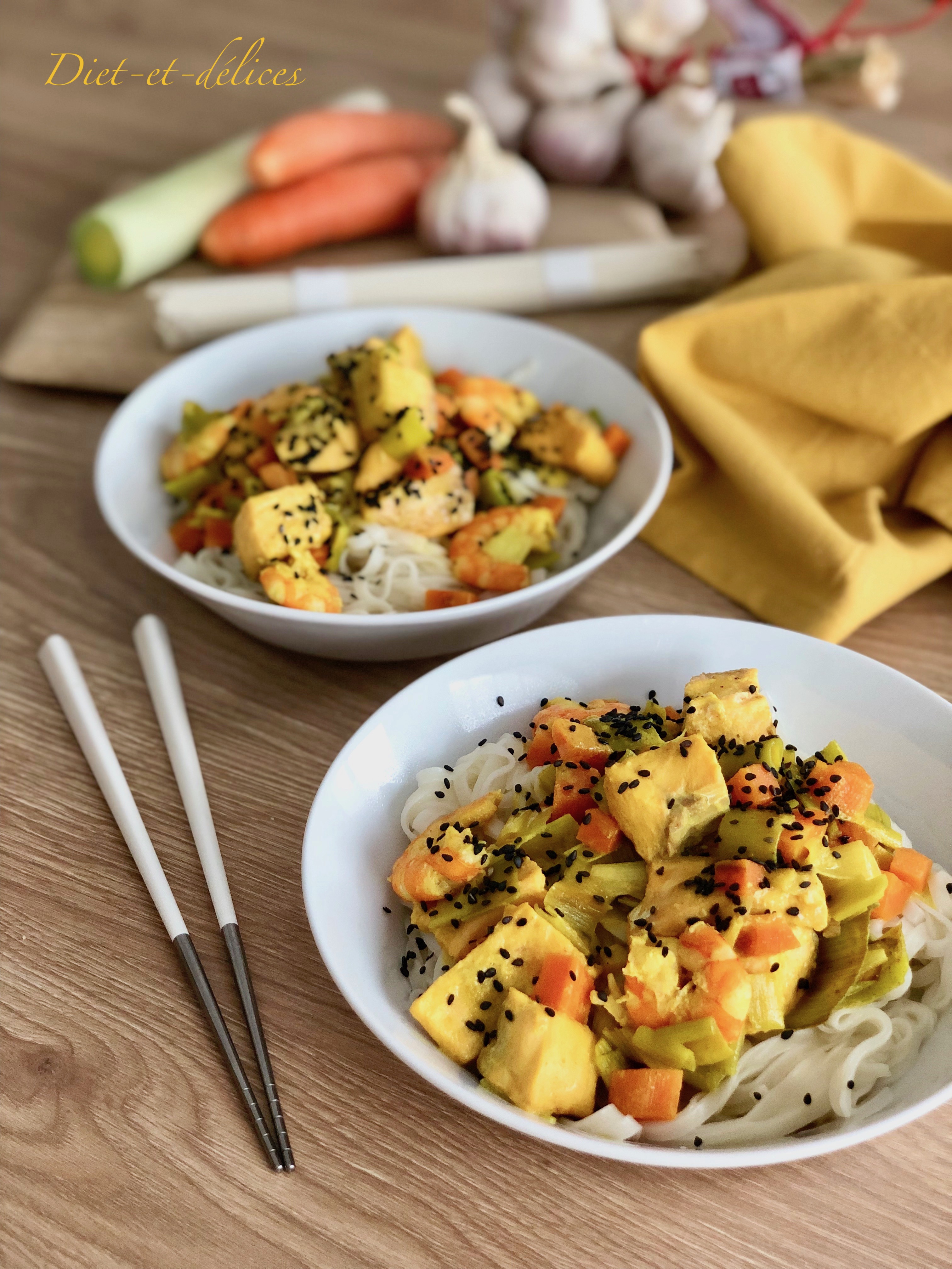 udon, nouilles, pavés de truitecrevettes, carottes, poireaulait de coco, plat complet, sésame noir