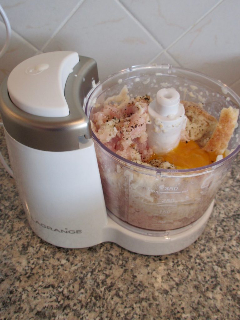 - Mixer les dés de poulet, le jaune d’oeuf, le pain essoré, le sel et le poivre afin d’obtenir un mélange homogène.