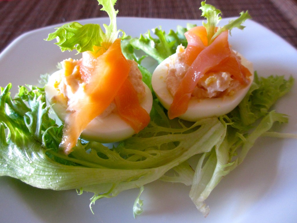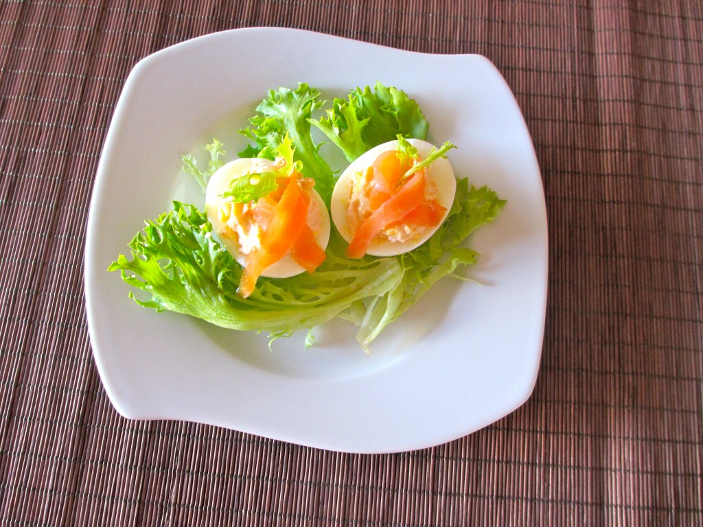 - Remplir les blancs d’œufs durs de la préparation puis décorer avec les bandes de saumon.
