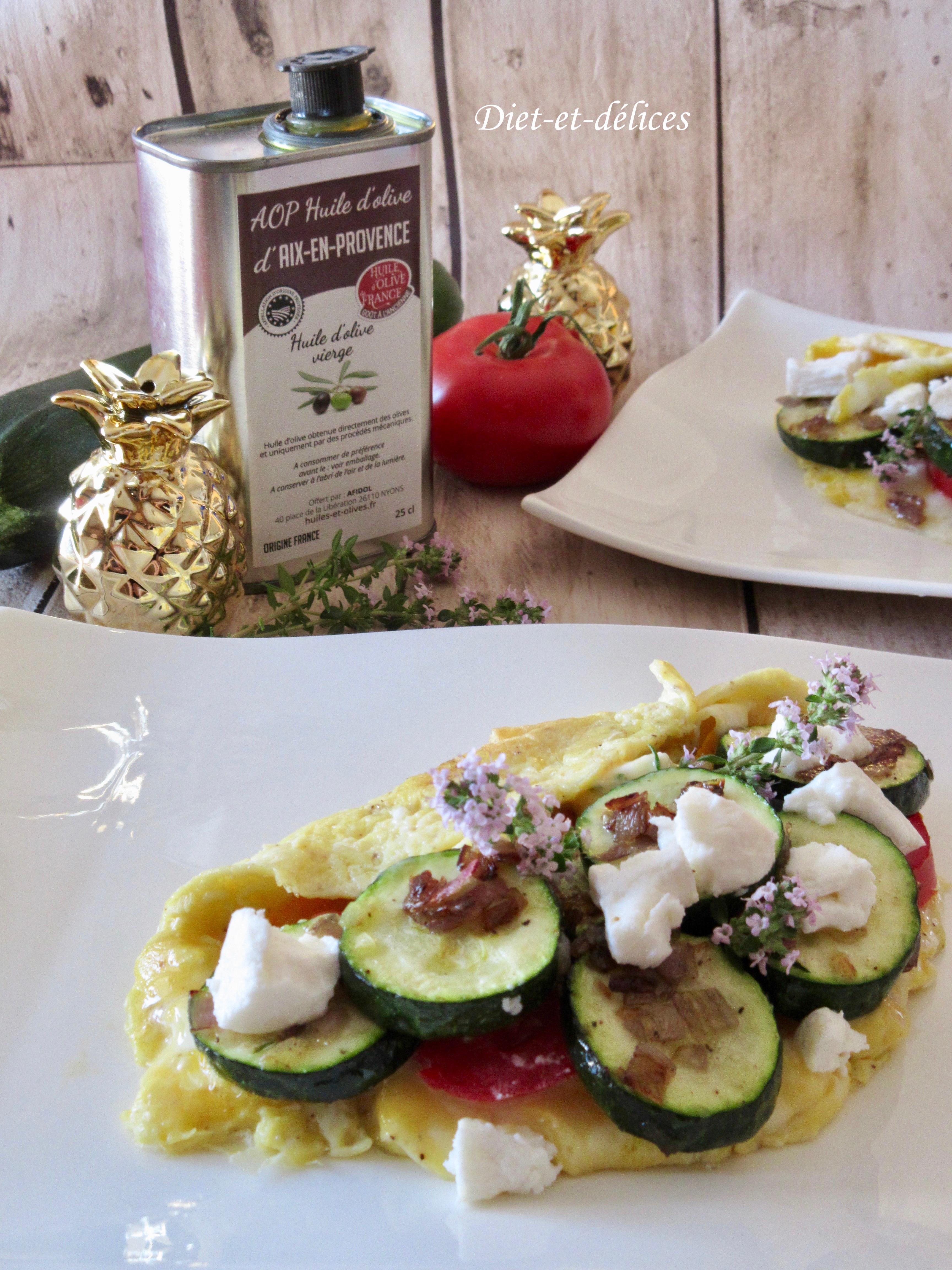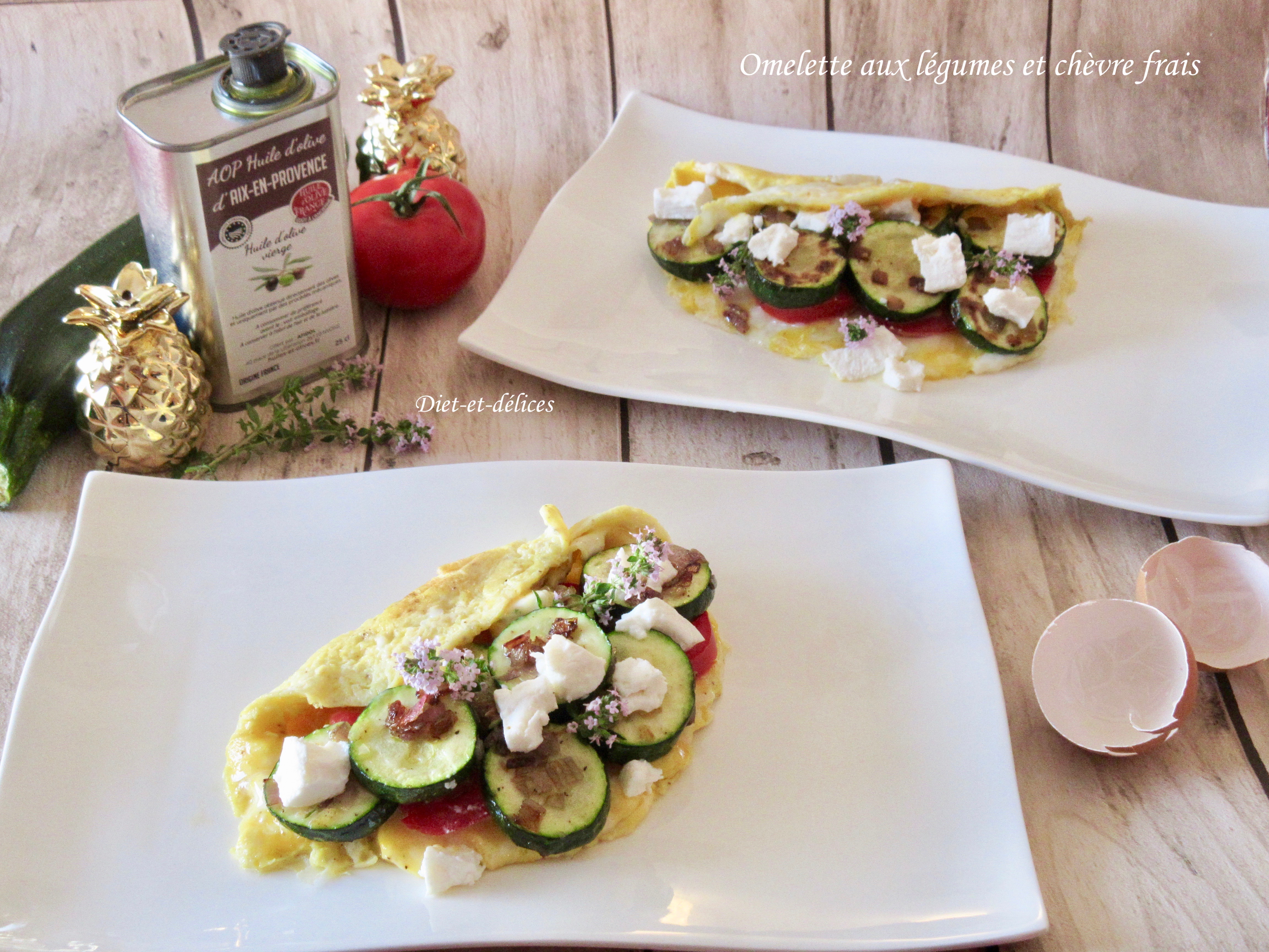végétarien, oeufs, omelette, courgette, tomate, chèvre frais, fleur de thym oeufs, omelette, courgette, tomate, fleur de thym, chèvre