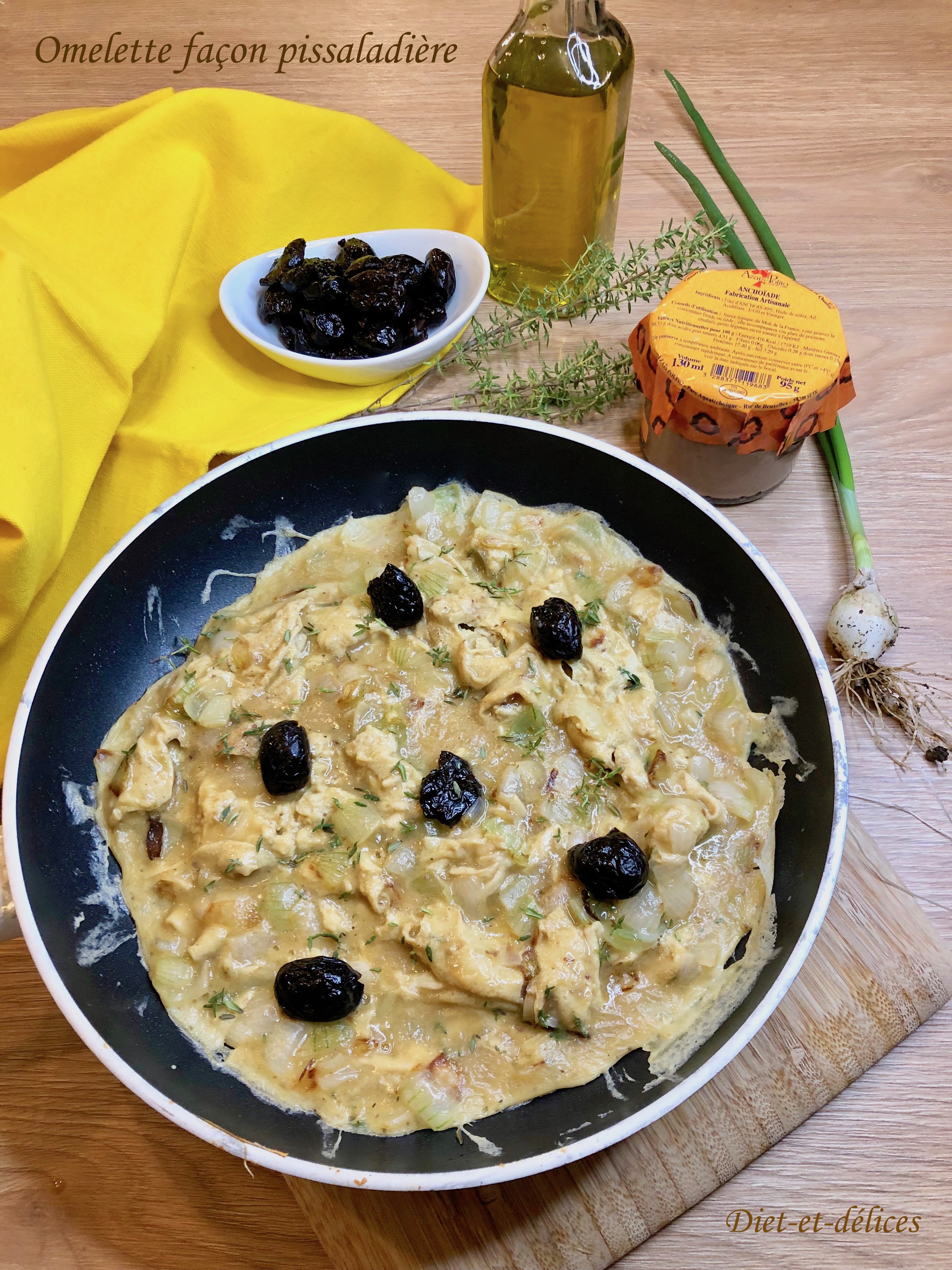 omelette, oeufs, pissaladièreomelette façon pissaladière, oignons, anchoïadeolives noires