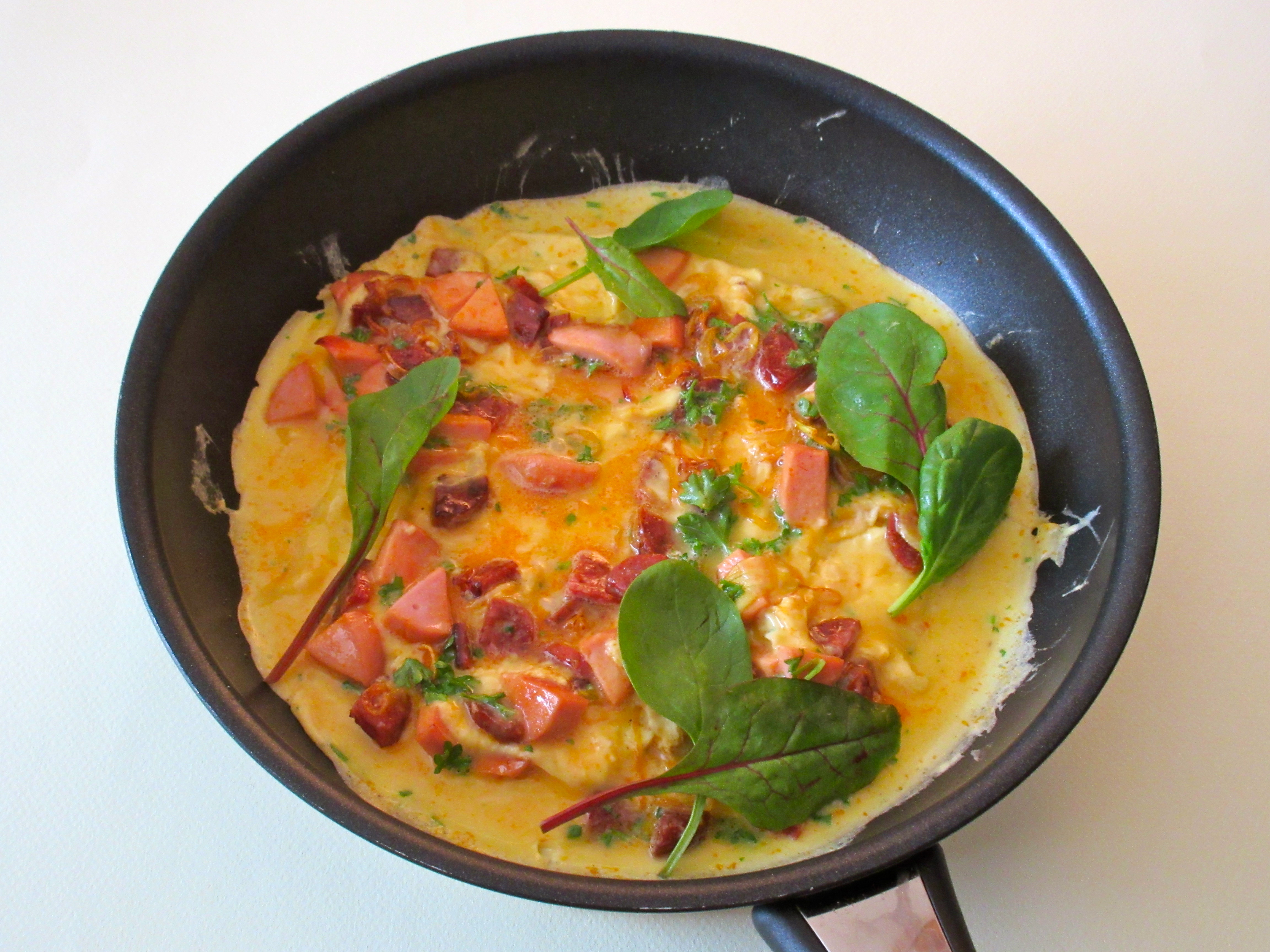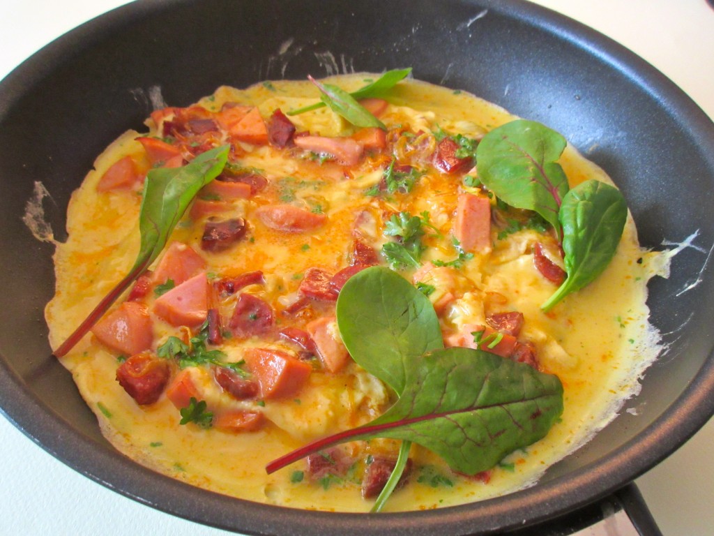 omelette, omelette au chorizo, chorizo, pousses de betteraves, oignons, oeufs, saucisse de viande,oignon, pousses d’épinards