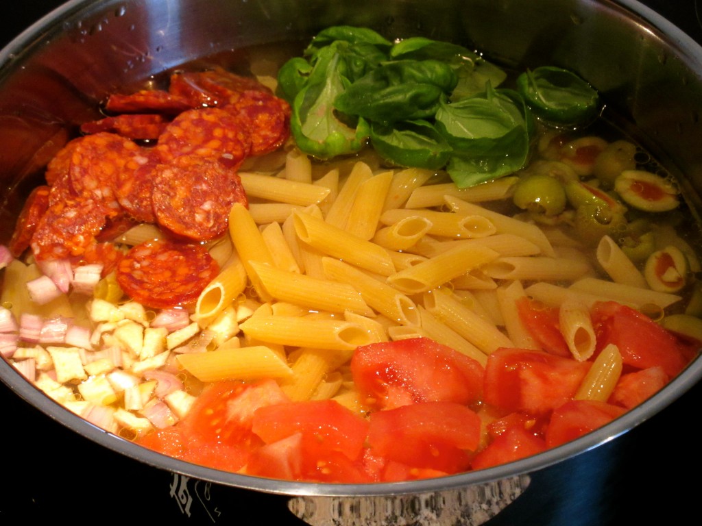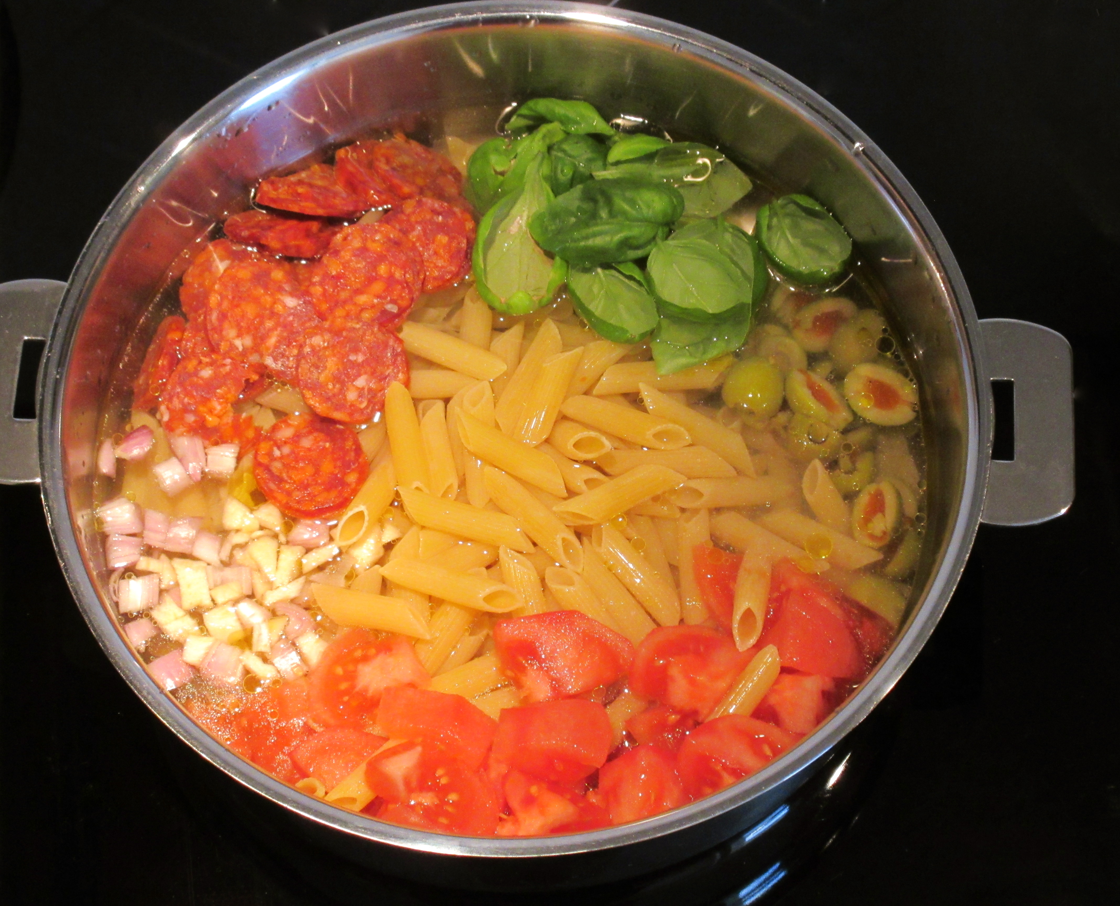 one pan pasta, pâtes, penne, chorizo, basilic, plat complet, tomates , olives