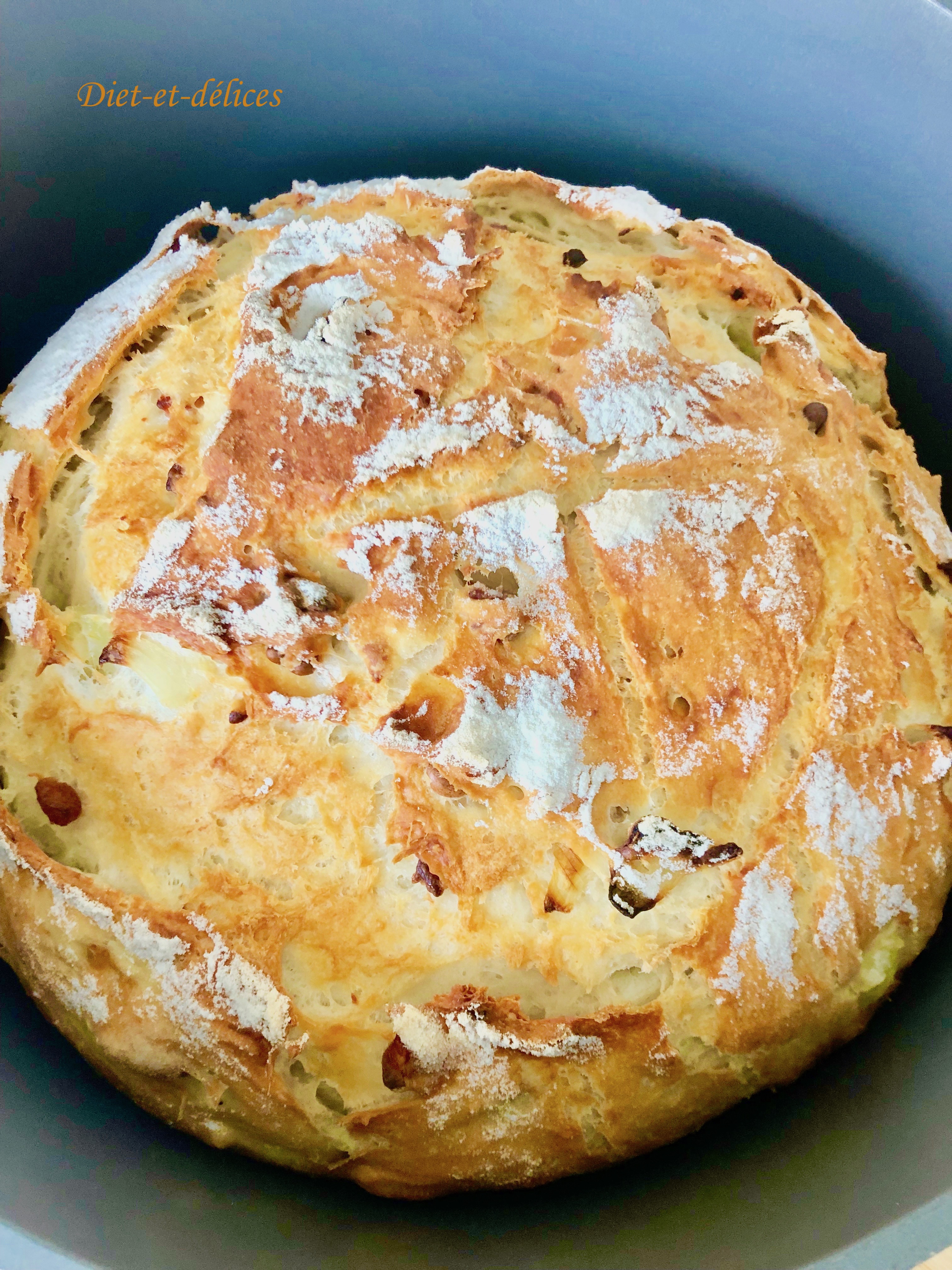 - Régler le four sur 240°C puis laisser cuire pendant 45 minutes. Retirer le couvercle puis poursuivre la cuisson pendant 15 minutes afin que le pain soit bien coloré.