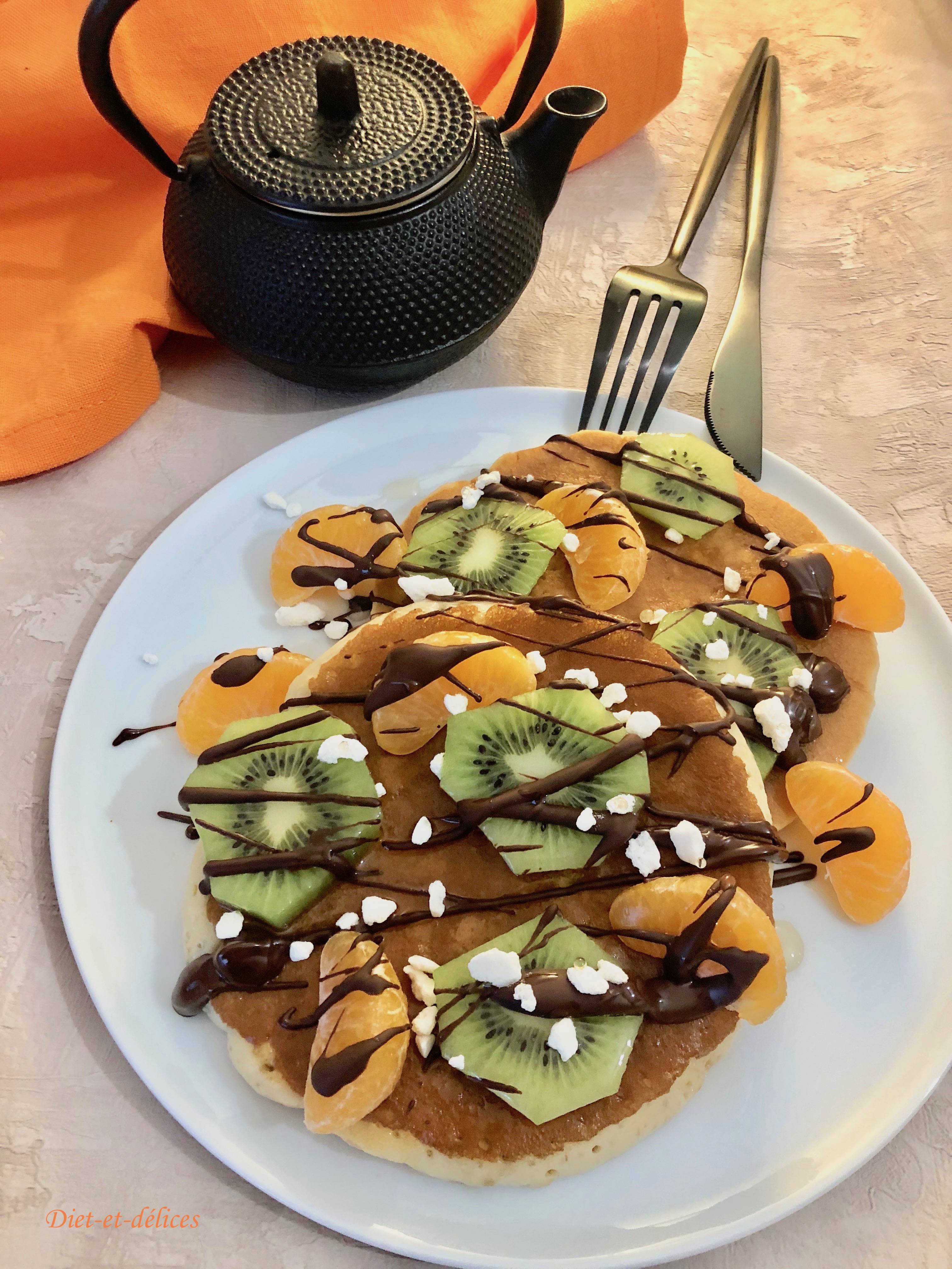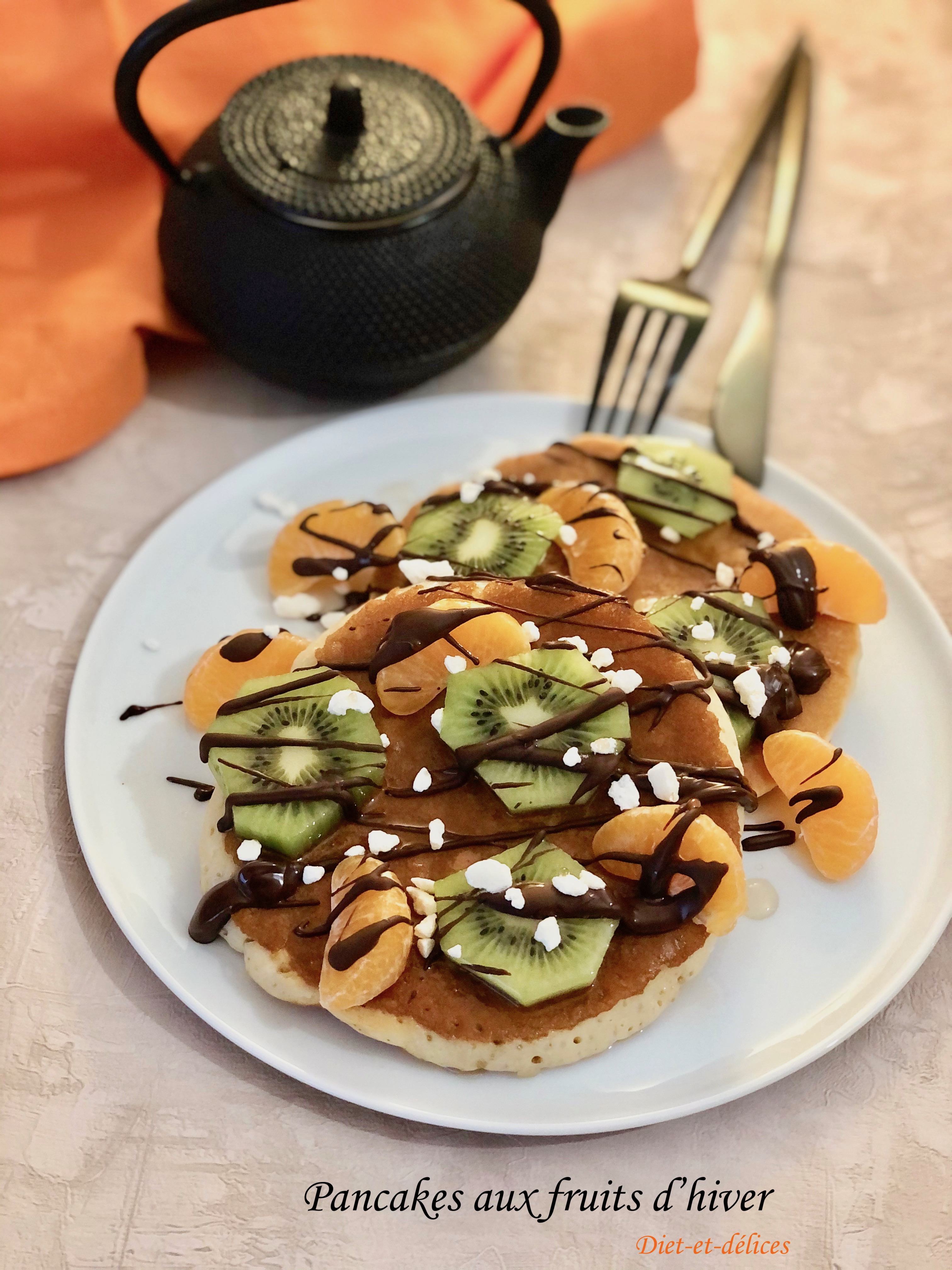 pancakes, petit déjeuner, kiwi, clémentine, sirop d’érable, chocolat