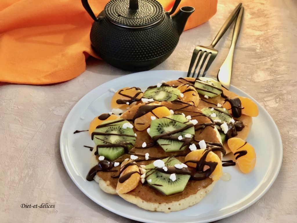 pancakes, kiwi, clémentine, petit déjeuner, sirop d’érable, chocolat