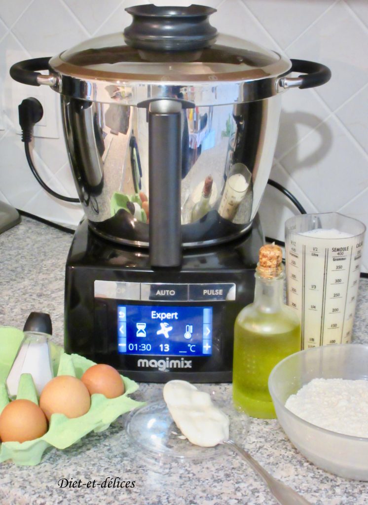 - Placer tous les ingrédients dans le bol inox du cookexpert en commençant par les oeufs et en finissant par la farine. Fermer le couvercle et le bouchon.