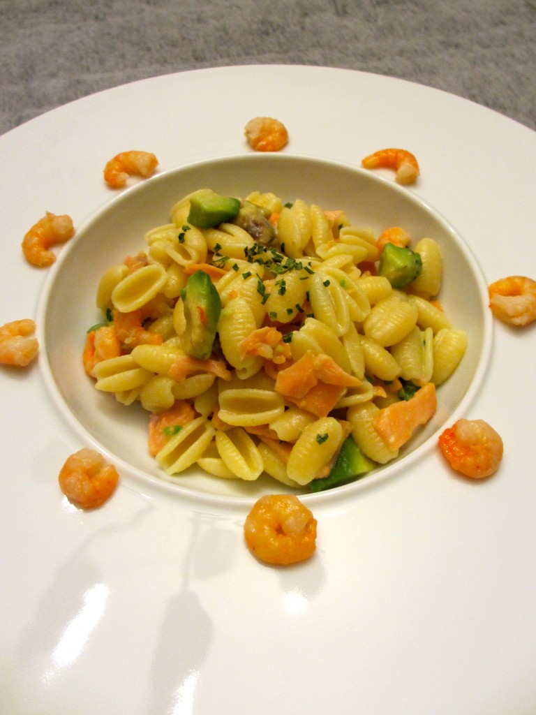 pâtes, pâtes au saumon, saumon, saumon fumé, plat, plat de pâtes , crevettes, poisson, crustacé, avocat, marine, pâtes aux crevettes plat complet, jus de citron, crevettes roses, plat de fêtes, fêtes, Noël
