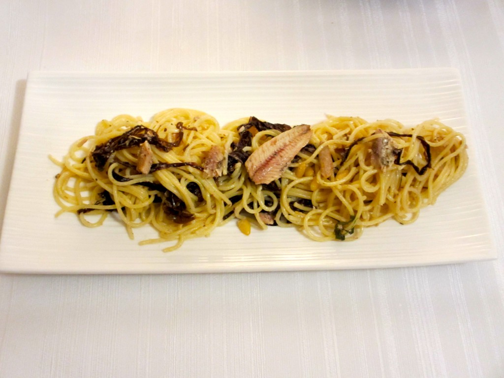 - Pendant ce temps, faire revenir dans une poêle les sardines coupées en petits morceaux et les pignons de pin pendant 5 minutes.