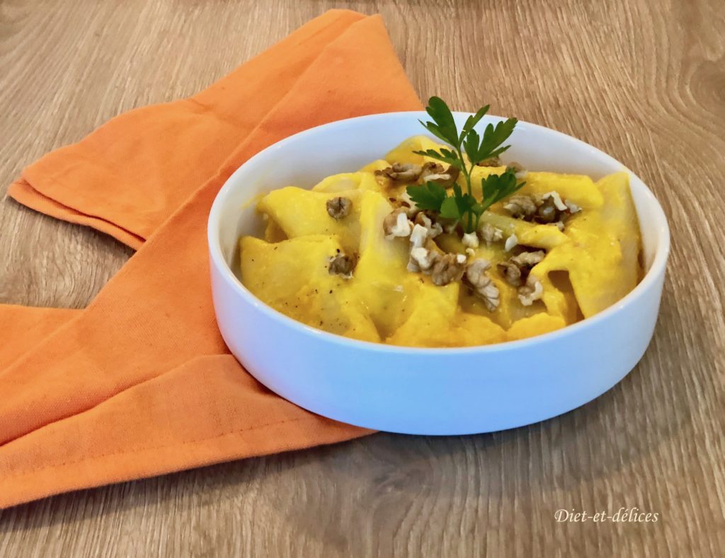 Une recette de pâtes qui s’associe parfaitement avec un légume de saison, le potiron. Les noix apportent du croquant à ce plat.