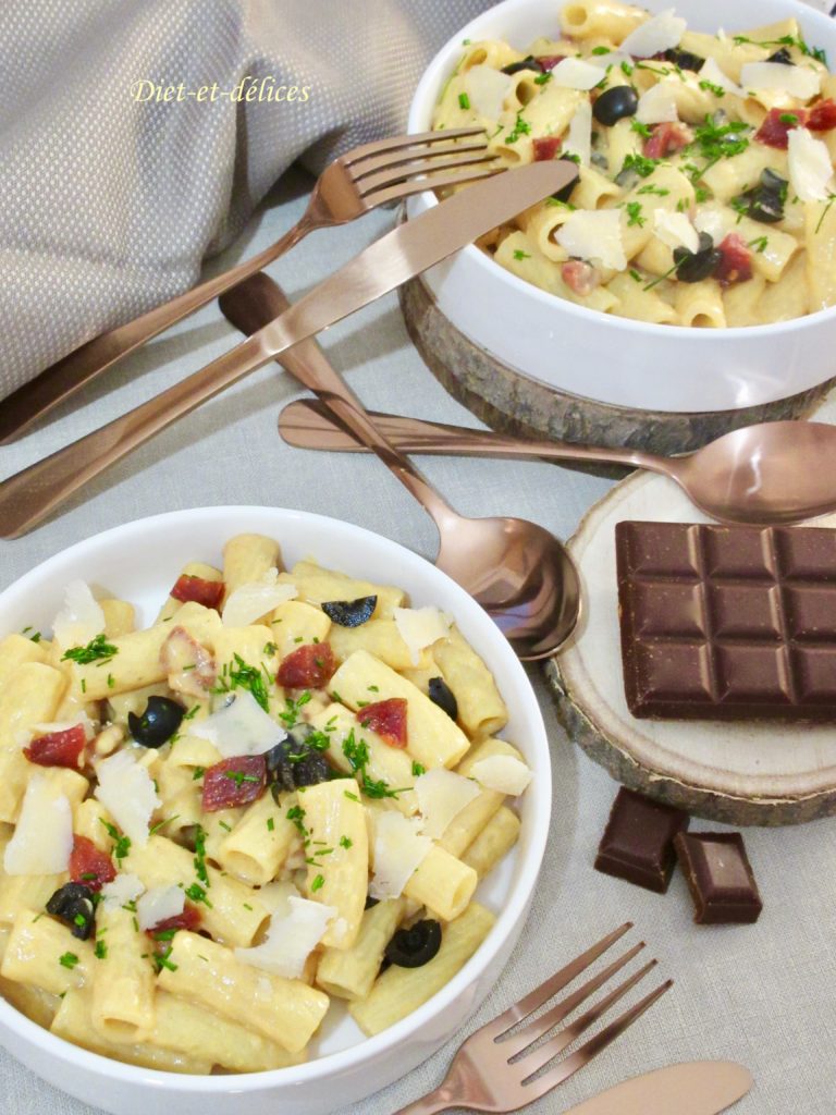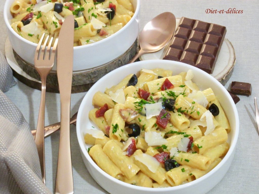 pâtes, béchamel, olives, pâtes à la béchamel, chorizo, plat complet