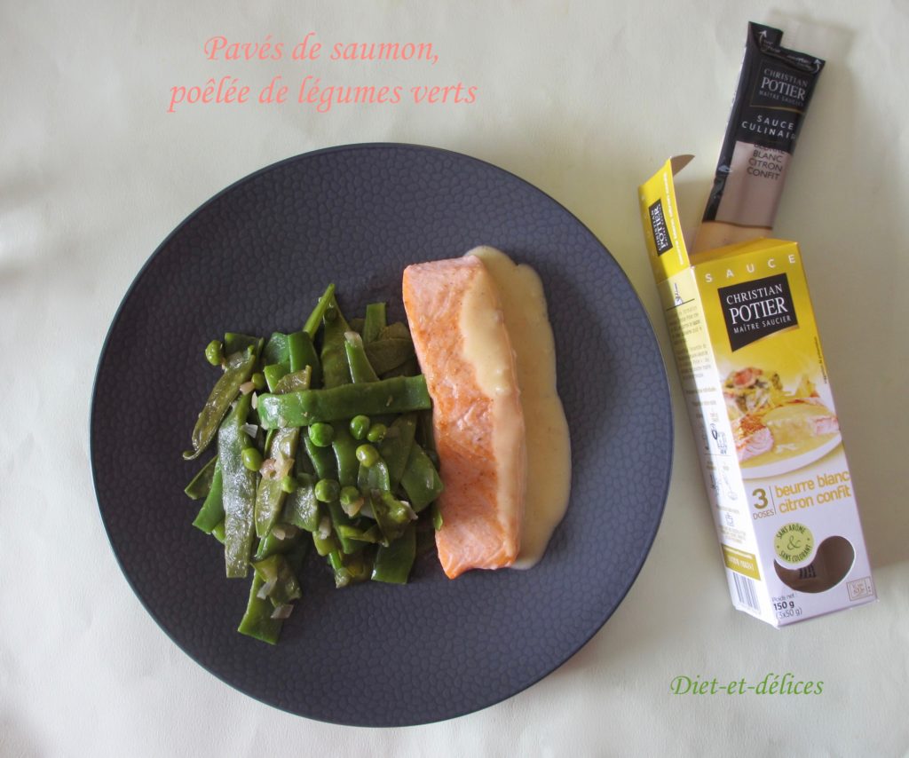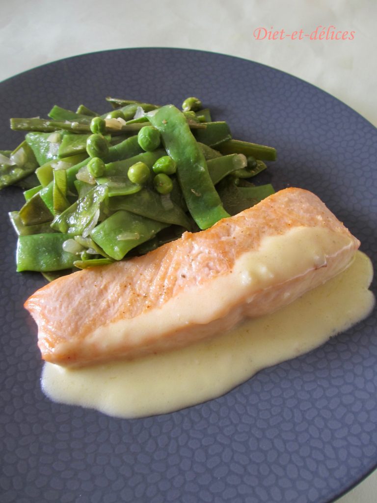 saumon, sauce beurre blanc, pois gourmands, petits pois, haricots plats
