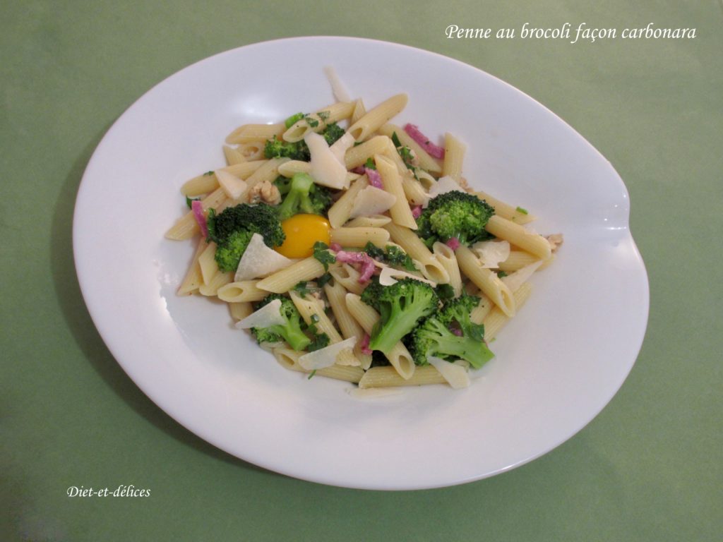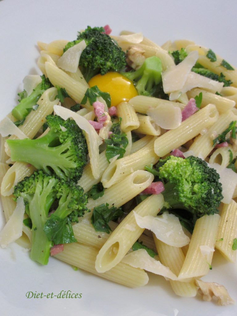 pâtes, penne, brocoli, pâtes carbonara, bacon, parmesan, oeuf, plat complet, noix