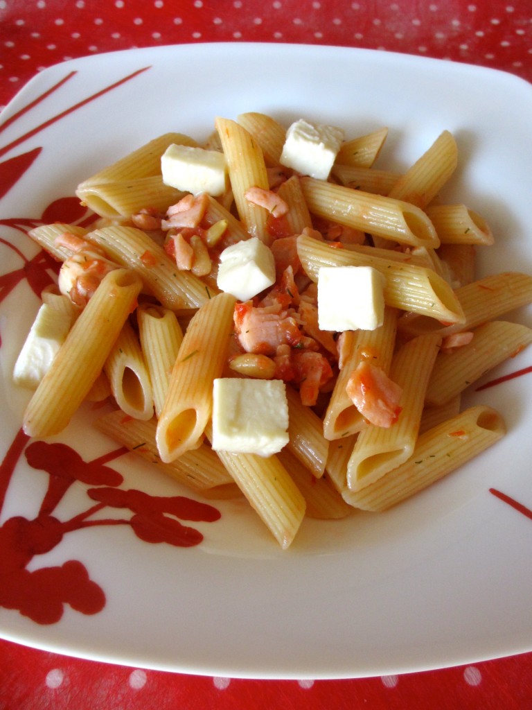 pâtes, penne, pâtes au saumon, pâtes au saumon fumé, saumon fumé, mozzarella féculents,sauce tomate, tomates, aneth, poisson, pignons de pin