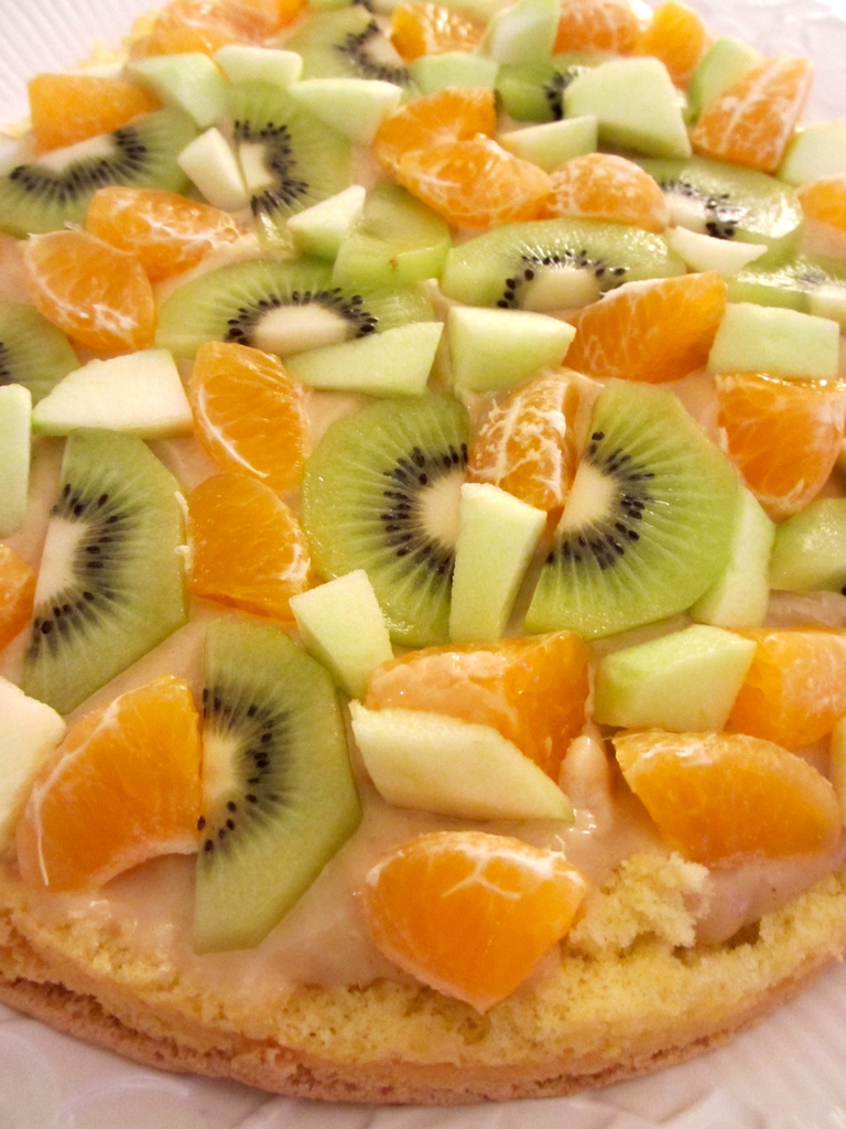 - Eplucher les fruits : répartir les dés de pomme, les demies tranches de kiwi et les quartiers de clémentines coupés en deux sur toute la surface de la génoise.