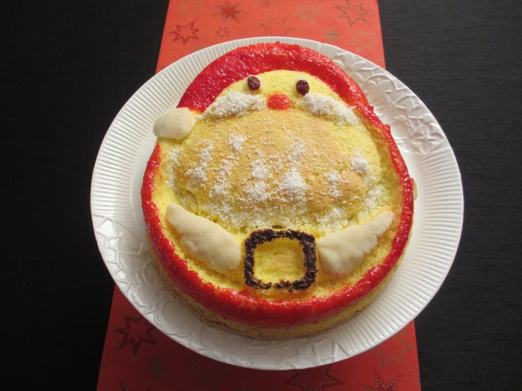 dessert, génoise, Noël, fêtes, père noël, dessert de noël, crème pâtissière, praliné, kiwi,pomme, clémentine, fruits, hiver, pâte d’amande, noix de coco