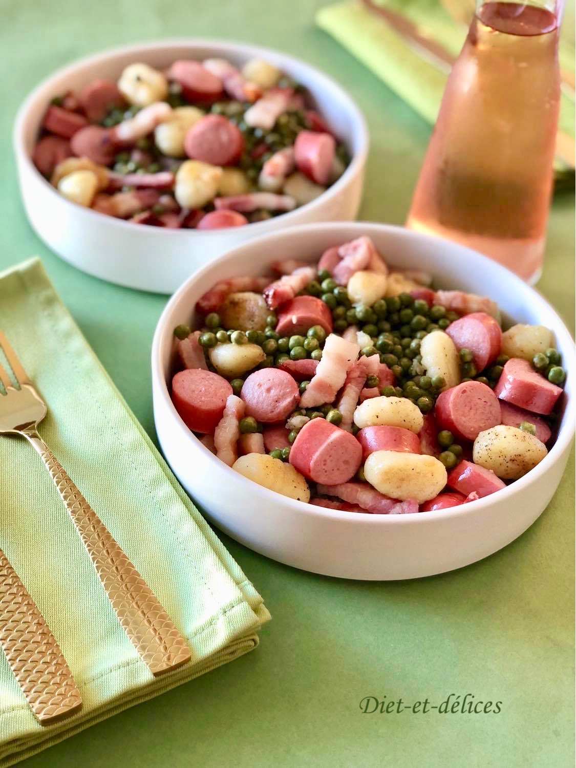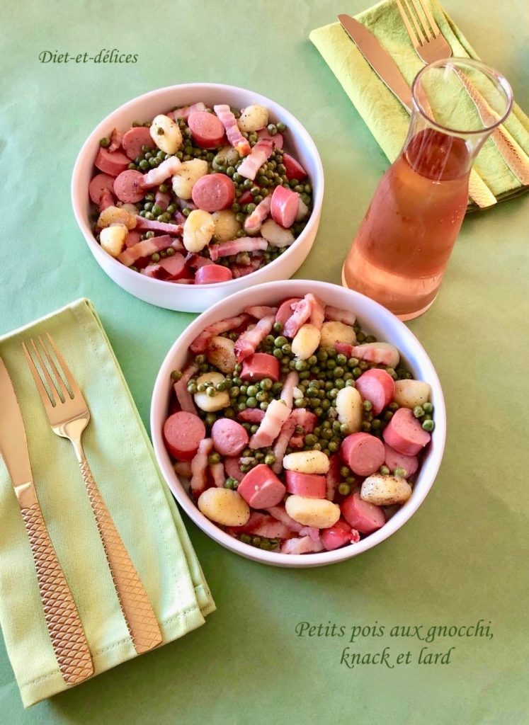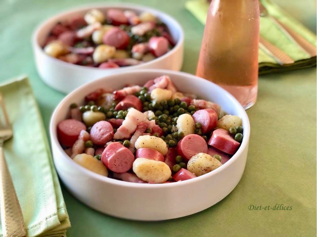 petits pois, knack, saucisse de strasbourg, gnocchi, lard, plat complet