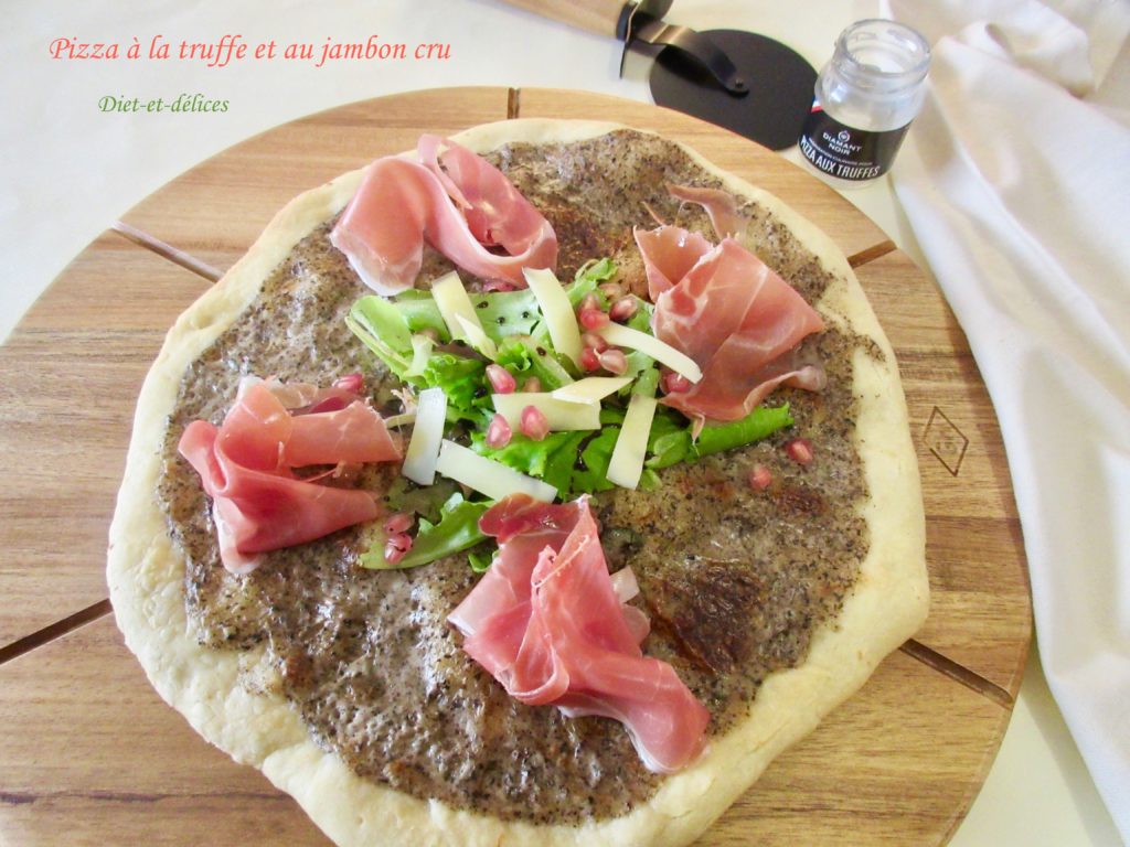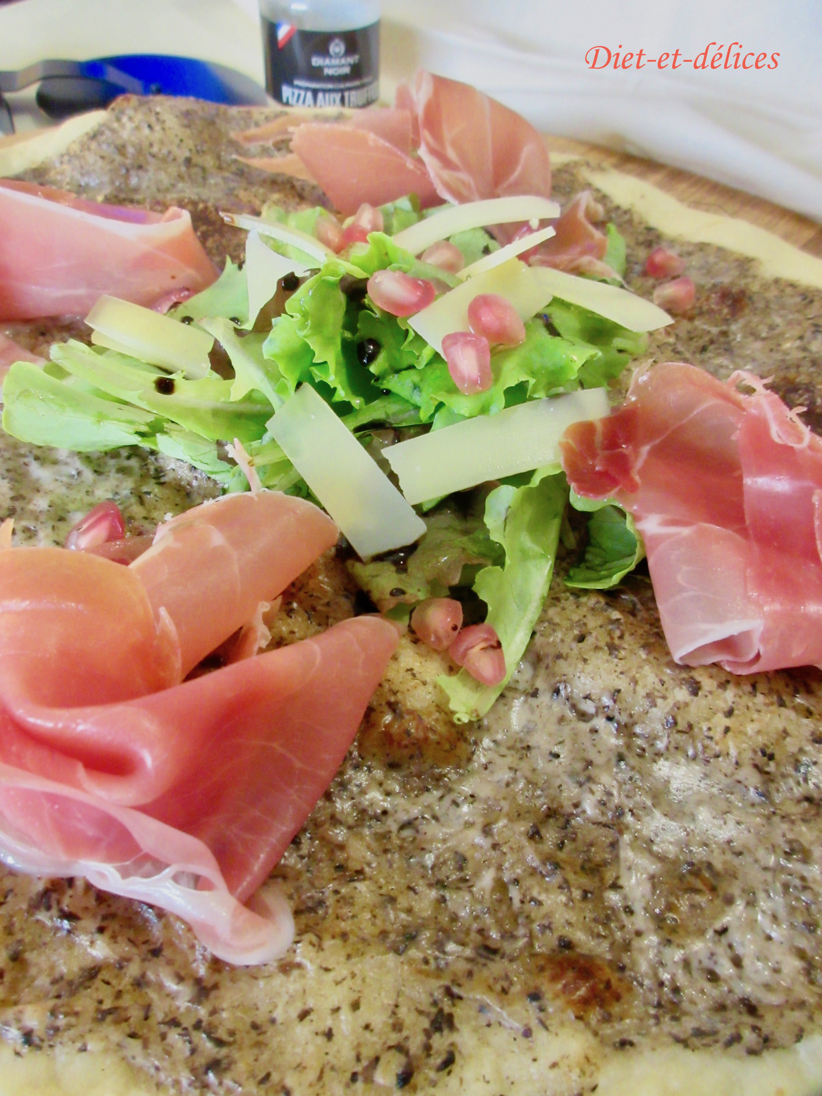 pizza, truffes, jambon cru, pizza aux truffes, mesclun, grenade, plat complet, comté