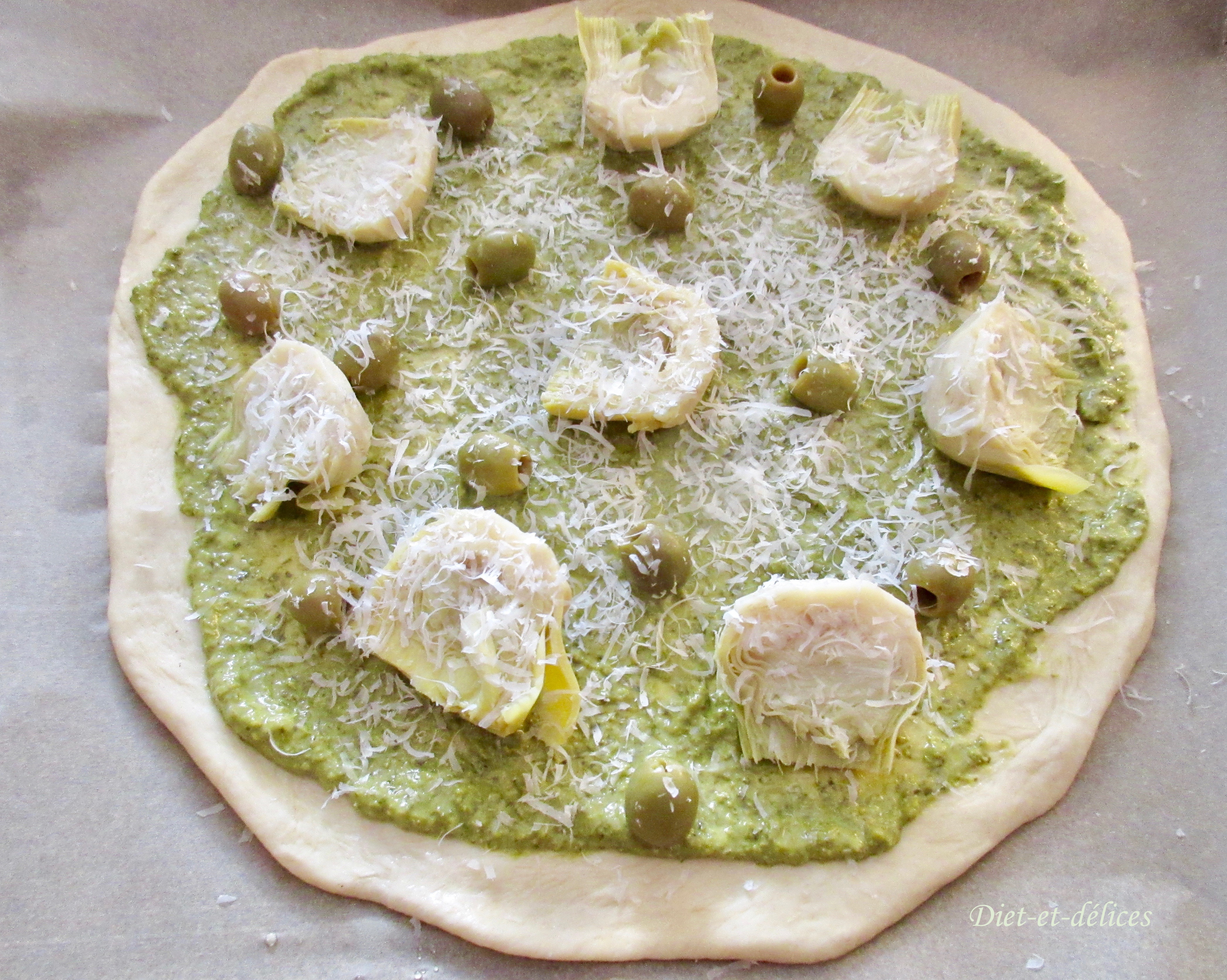 • Répartir le pesto sur la pâte à pizza puis y ajouter les coeurs d’artichauts coupés en deux.