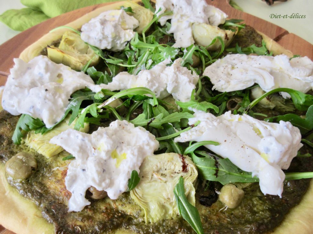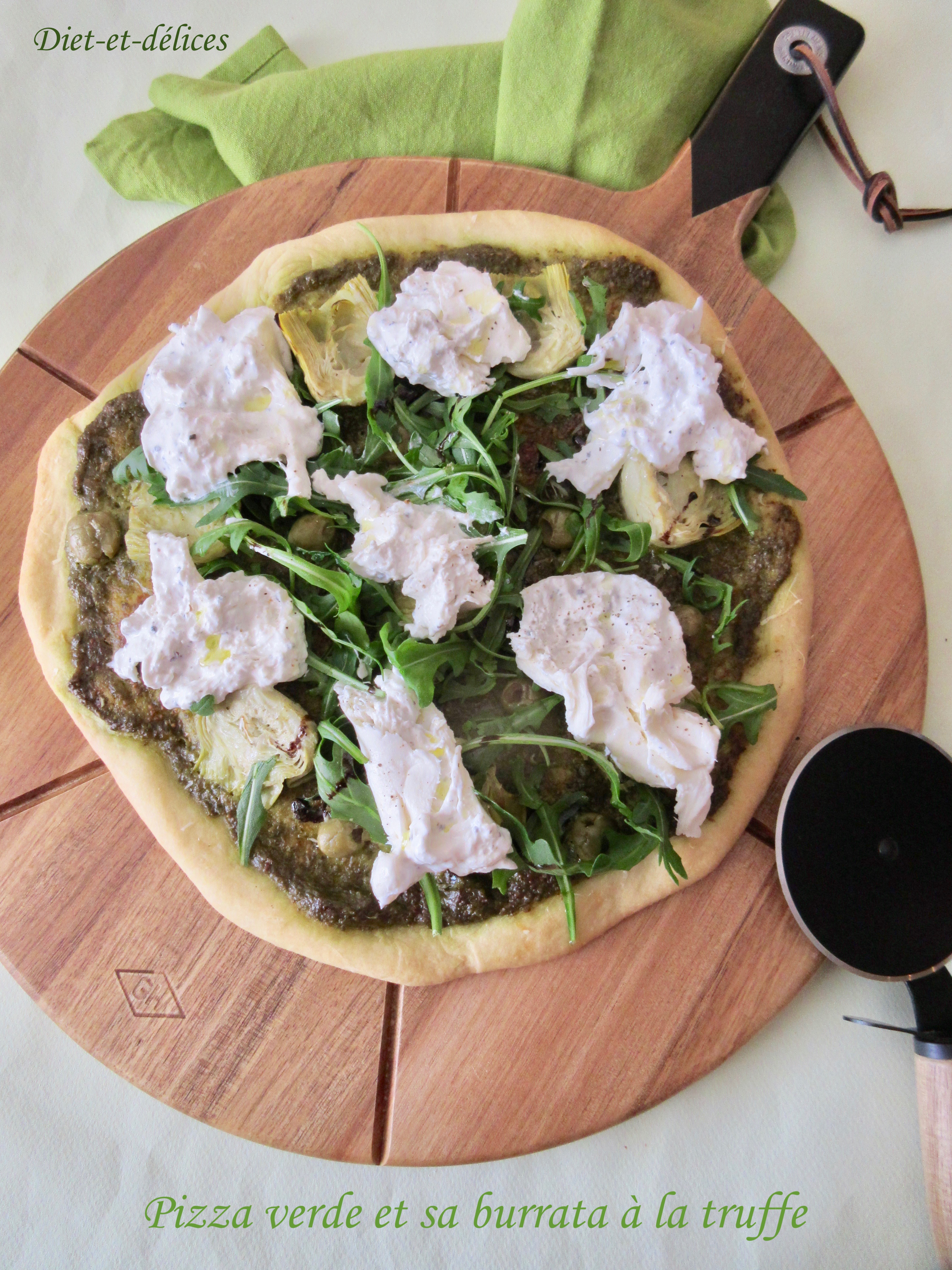 pizza, pesto, burratapizza verde, coeur d’artichaut , burrata à la trufferoquette, olives, plat complet