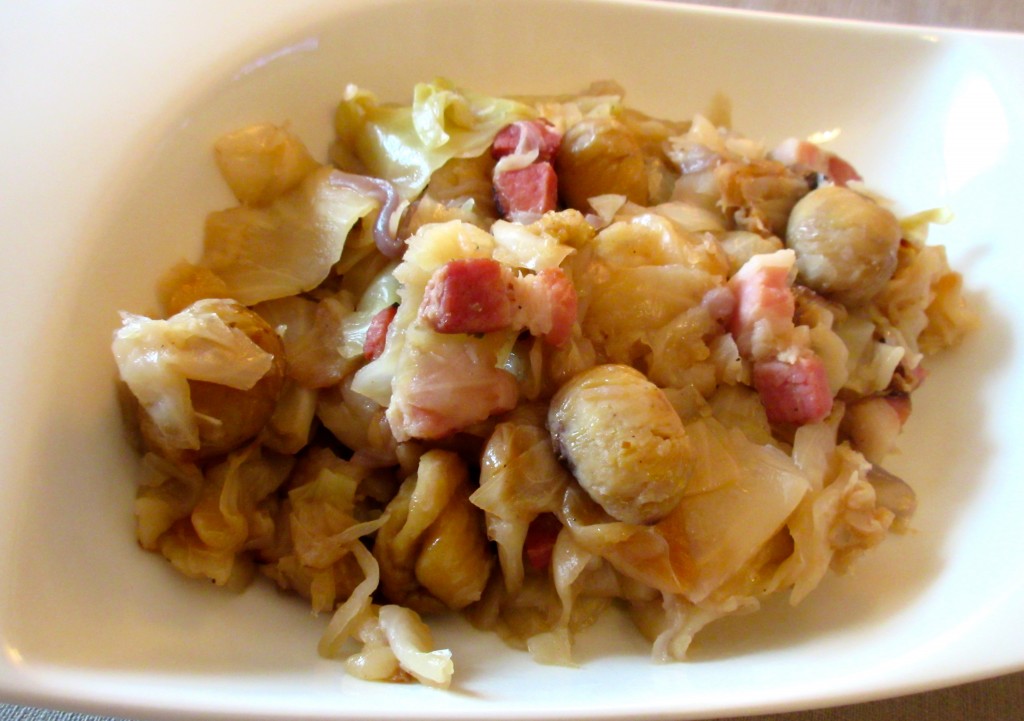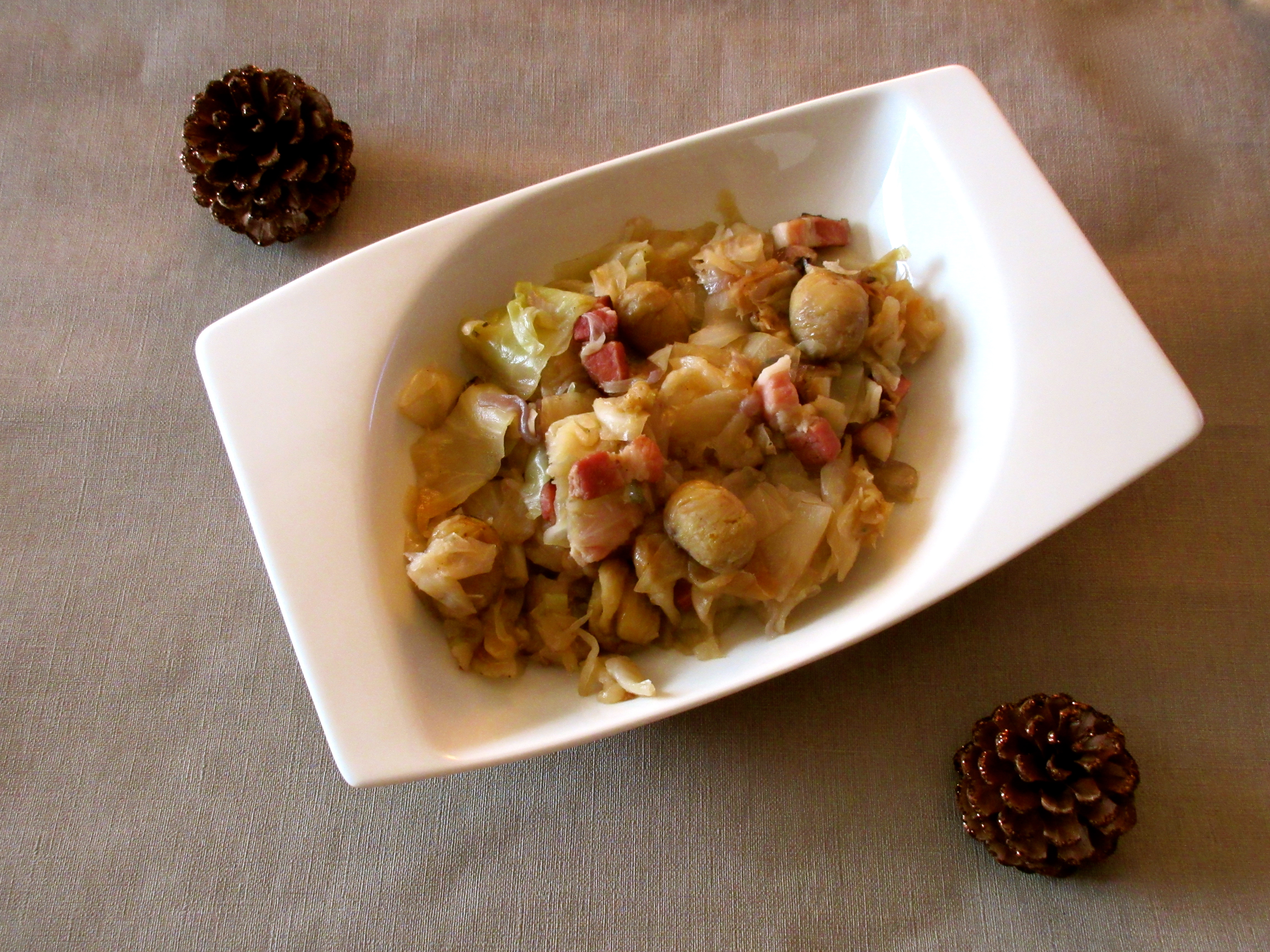 chou, chou blanc,poêlée, poêlée de chou,poêlée de légumes, châtaignes, poêlée de châtaigne,lard, légumes