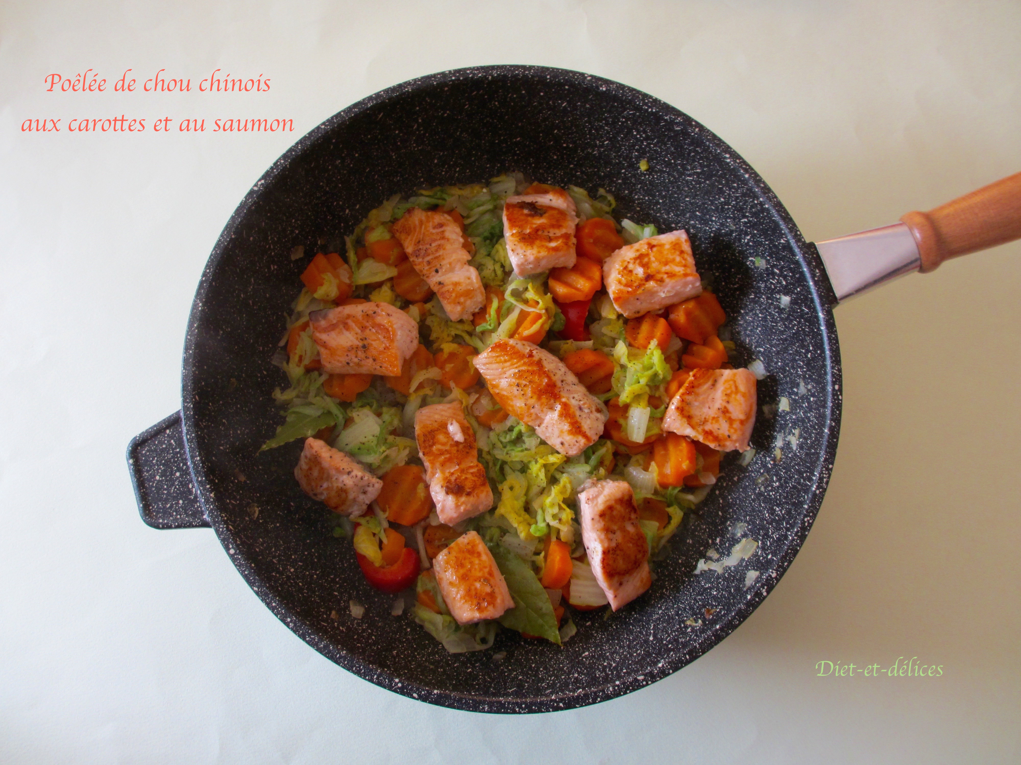 poêlée, chou chinois, saumon, poêlée de chou chinois, chou chinois au saumon, saumon grillé, poêlée de chou chinois au saumon, carottes, sauce soja, poêlée de chou chinois au saumon et carottes, gingembre, huile de sésame, cuisine asiatique, cuisine du monde, plat complet, poisson, cuisine équilibrée, cuisine diététique