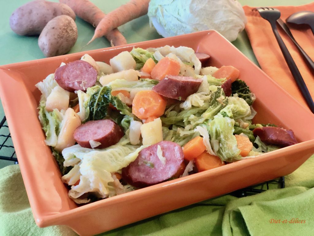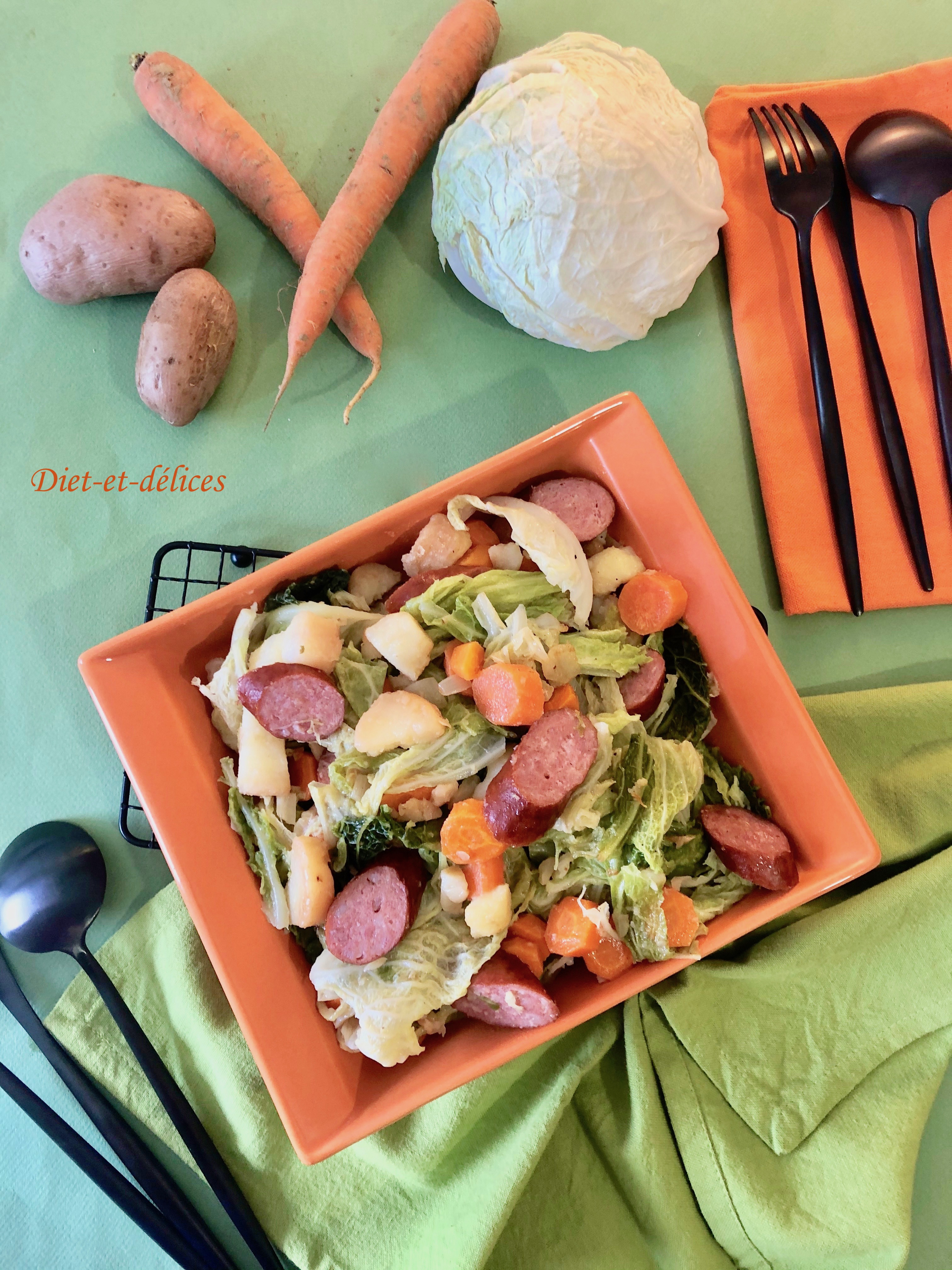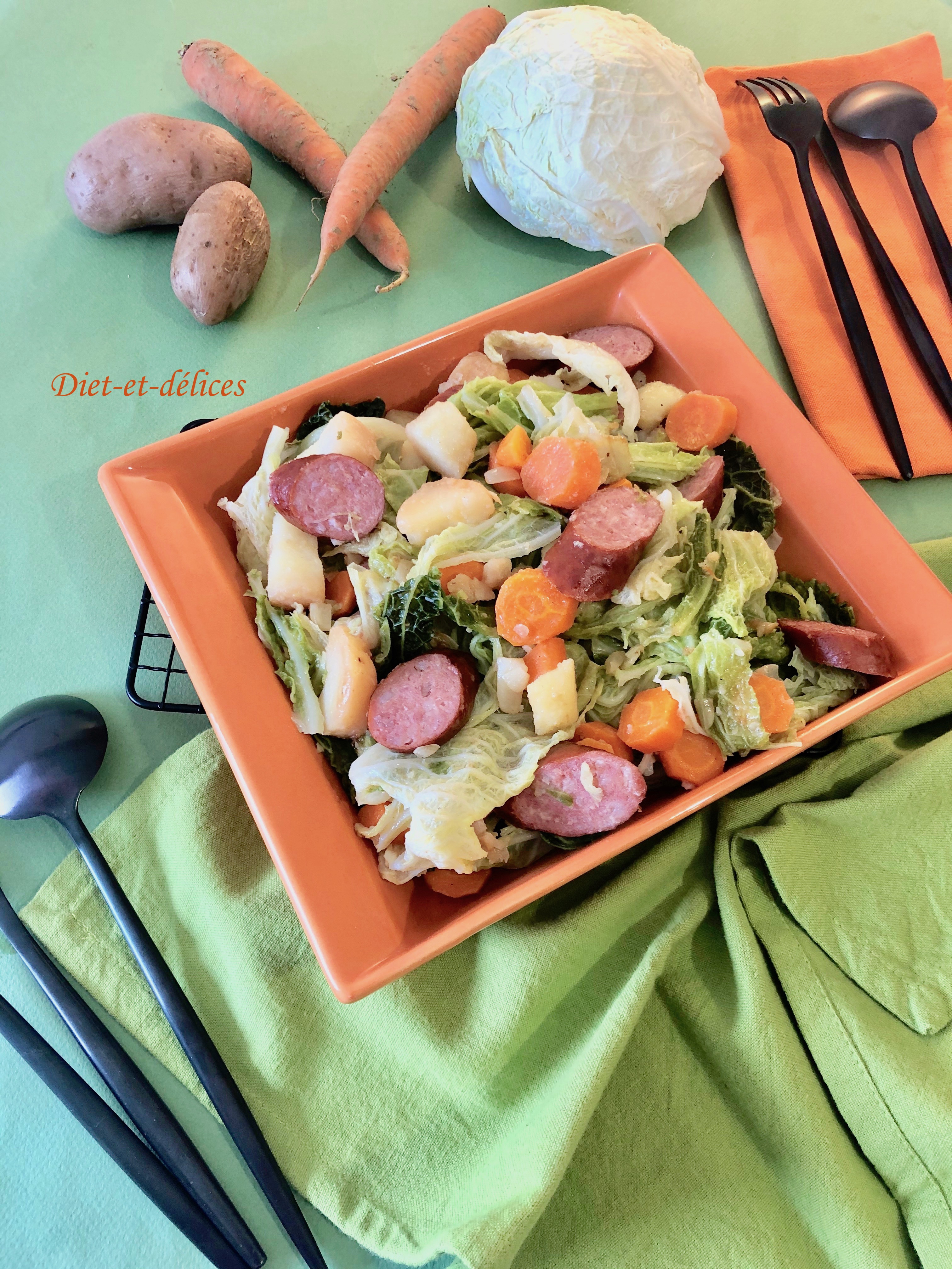 poêlée, poêlée campagnarde, saucisses à cuire, chou , chou vert, chou frisé, carotte, pommes de terre, plat complet