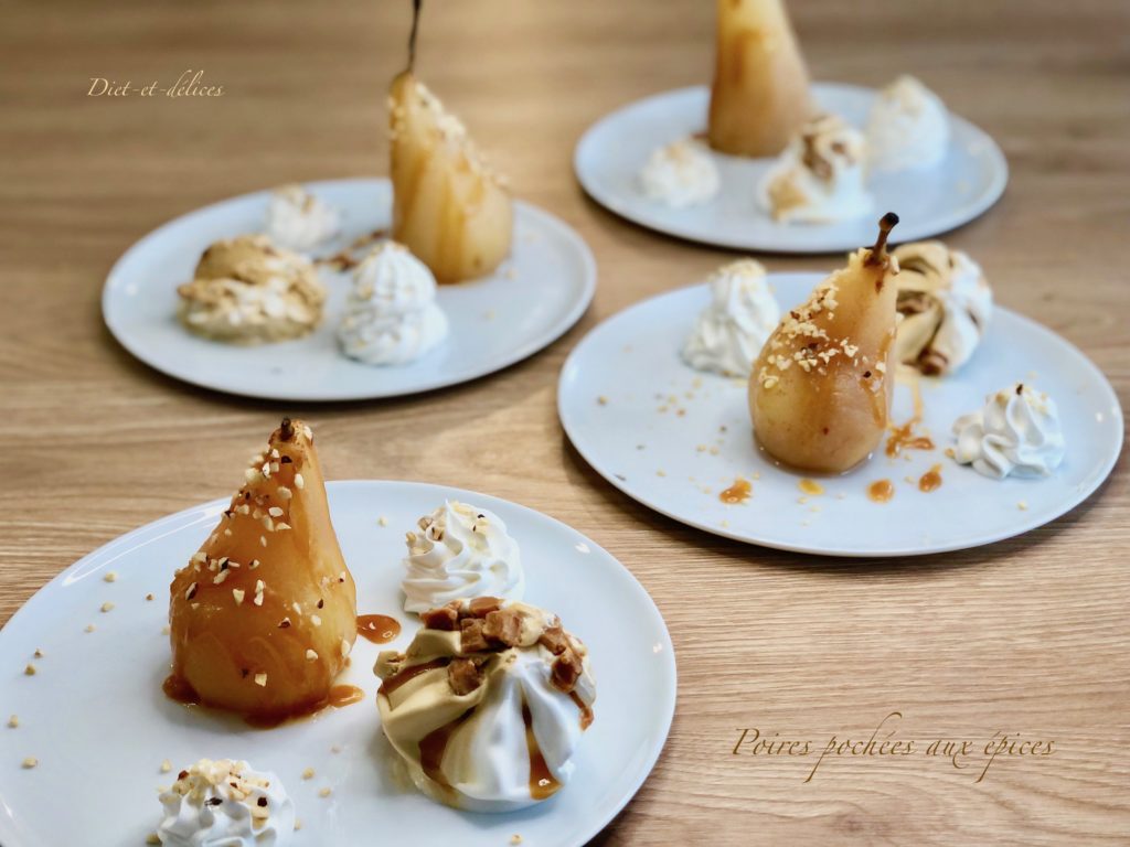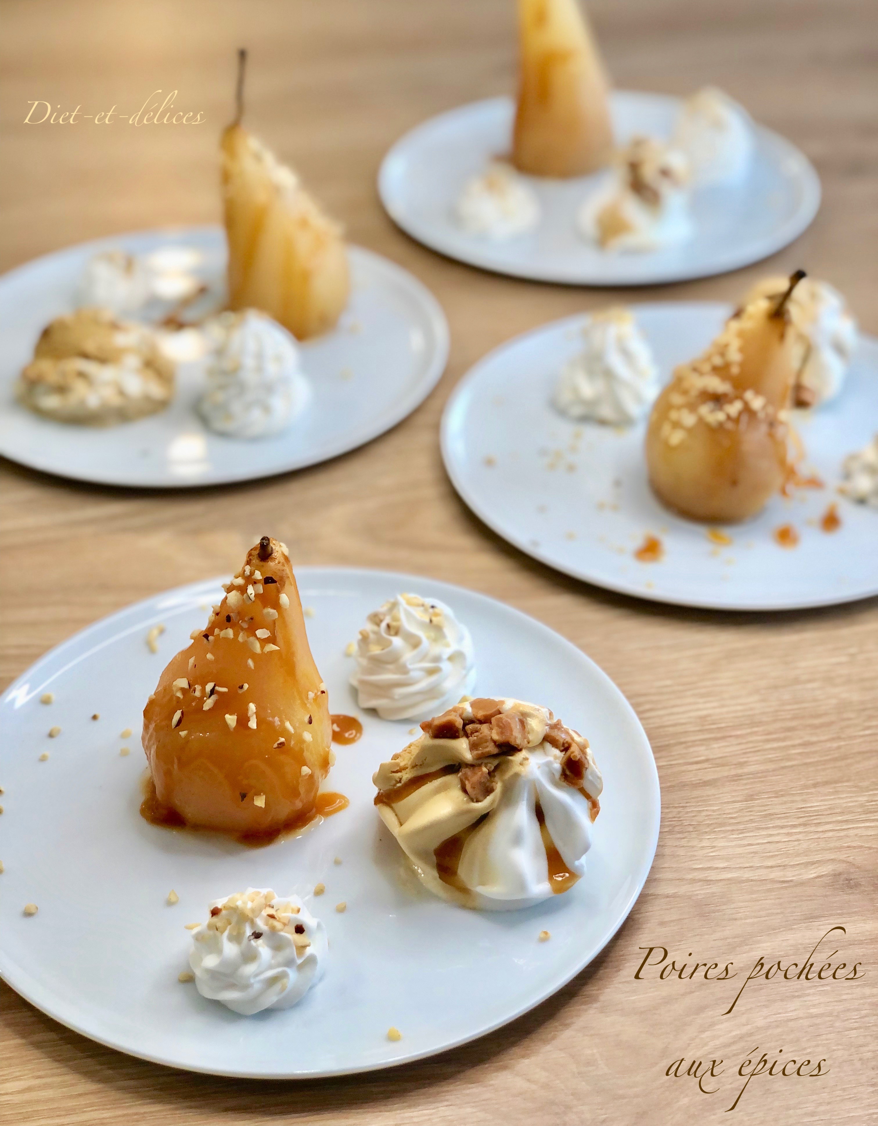 poires, poires pochées, dessert, épices, badiane, cardamome, cannelle, vanille, fruits