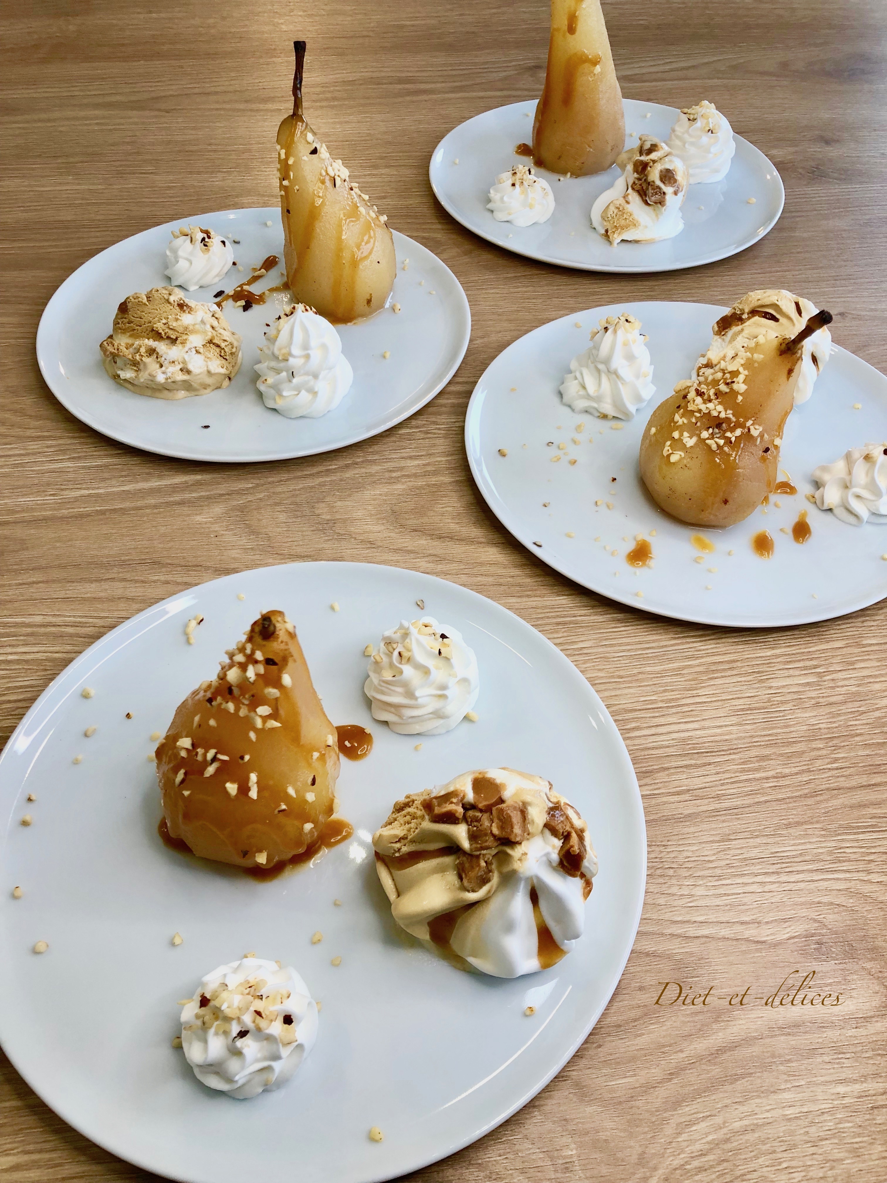 – Pour plus de gourmandise, il est possible d’accompagner ces poires pochées de caramel au beurre salé, de glace et de chantilly.