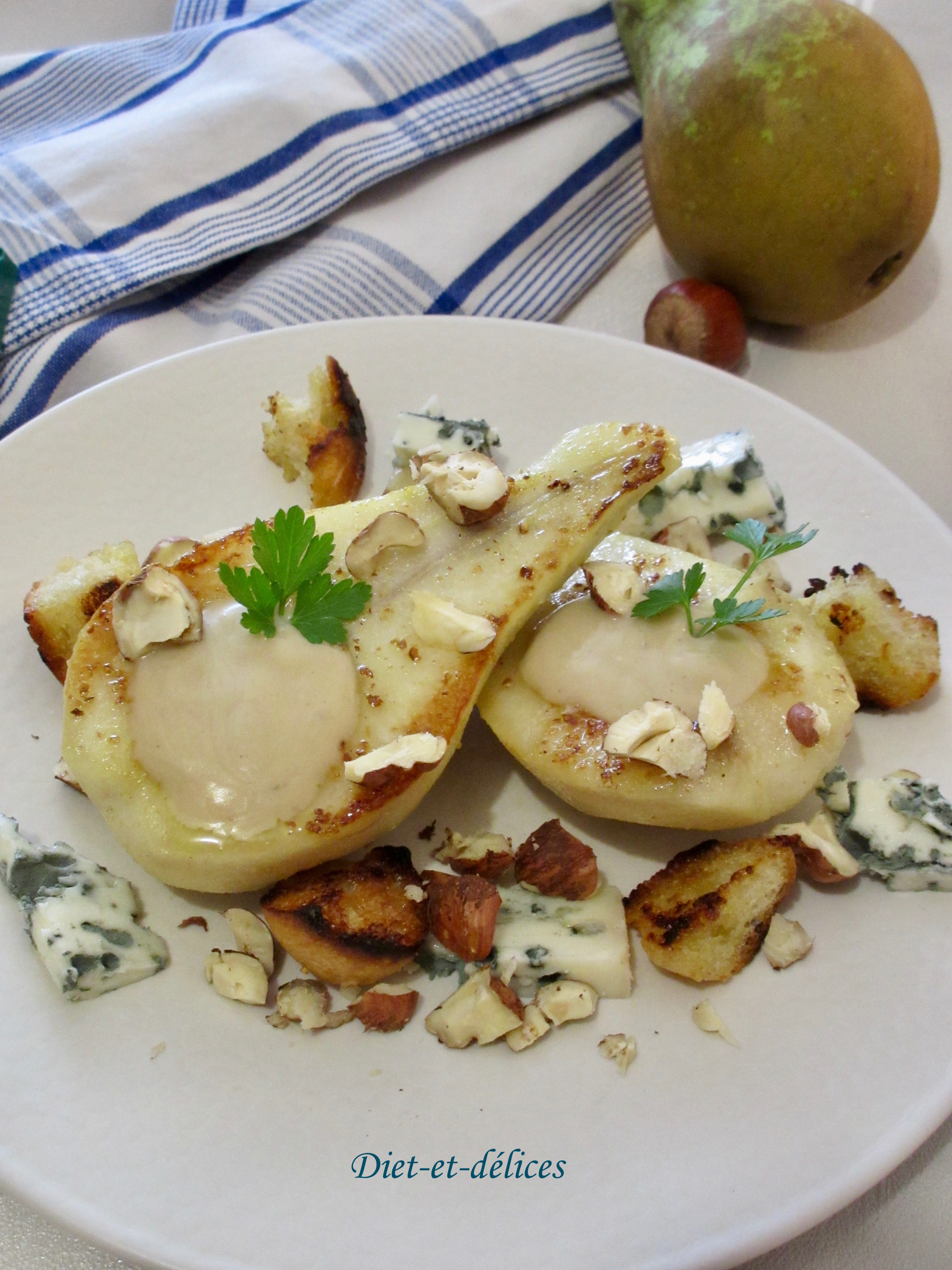 entrée , roquefort, sucré salé, poire, noisette, végétarien, poire rôtie
