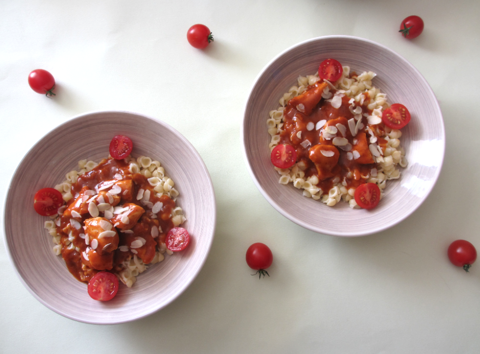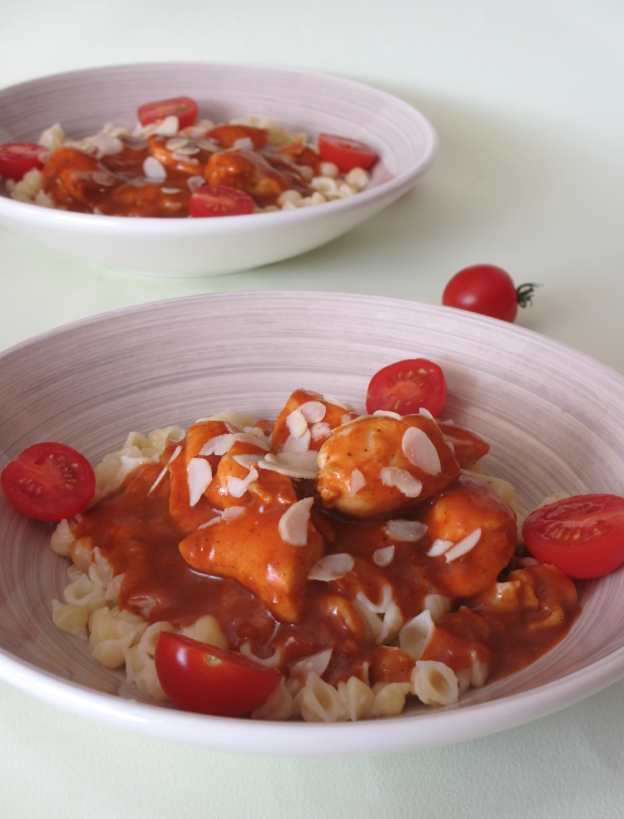 poulet, poulet tandoori, volaille, poulet sucré salé, sucré salé,cuisine du monde, cuisine indienne, amandes,amandes effilées, tomates cerises, plat complat,sauce